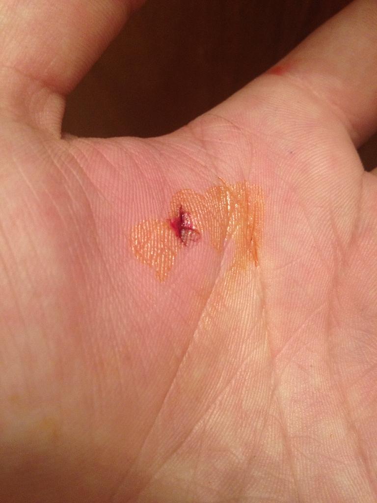 And here is the wound. Doesn't look like much but I made it about a 1/4" into the palm.