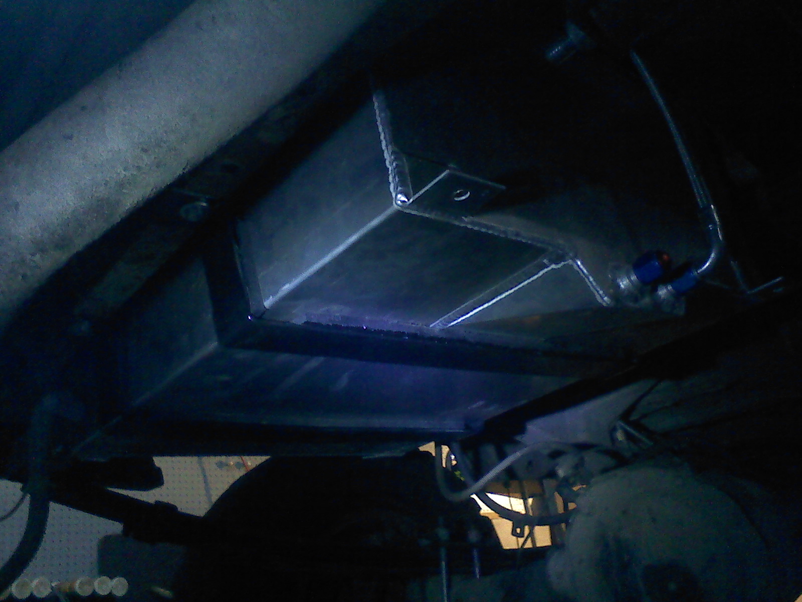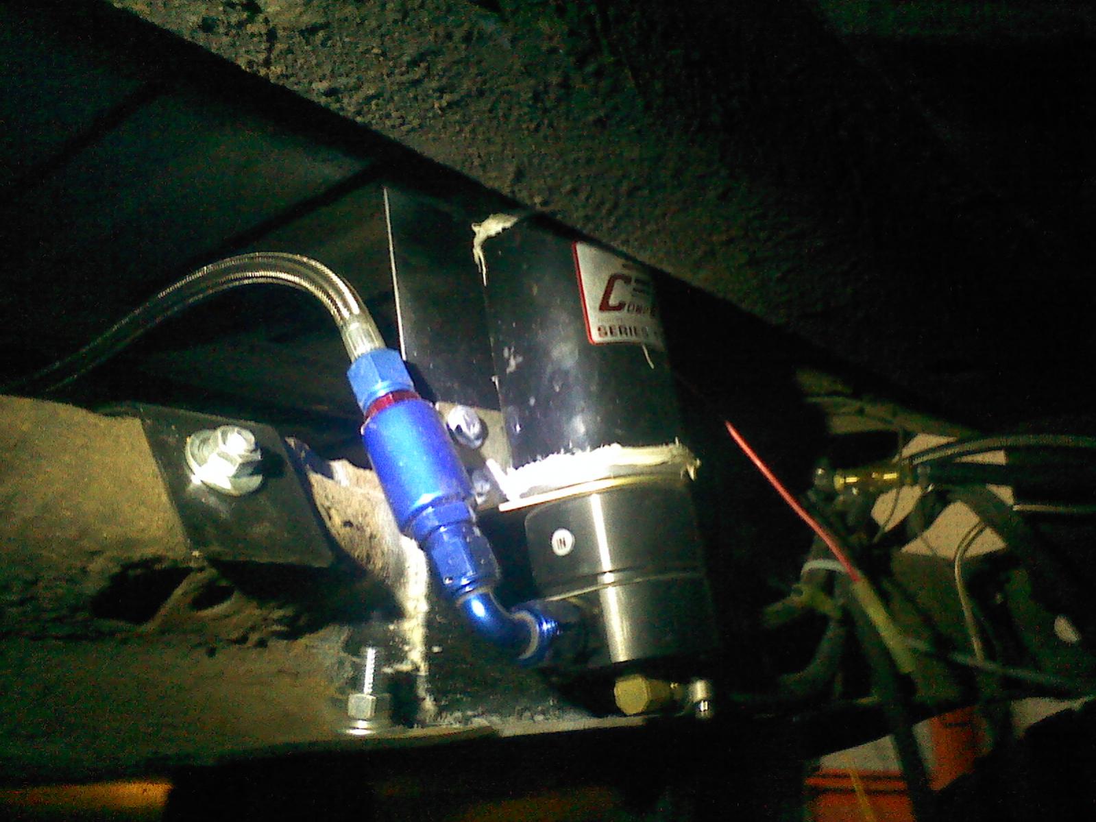 ok heres the pics i promised. As you probably figured its a tight fit. There is only about 2.5 inches between the radiator and the water pump. In the 3rd pic is off the new shock mount i had to make since i had to cut the old one off to clear the exhaust manifold. It still needs a little more welding then some paint. The 4th pic is of the 20gal fuel cell mounted up under the truck. The last pic is the fuel pump which is mounted on the crossmember in front of the fuel cell.