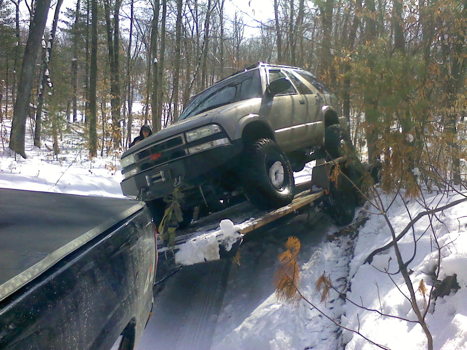 Sorry to disappoint you guys but i have no videos or pictures to show you. The weekend was a complete waste of a trip. The snow was way to deep where we went and we spent the whole afternoon saturday getting stuck and unstuck. The restuck again. It was fun for the first hour. After that it wasnt. We finally gut unstuck and back to the main road around 11:30 saturday night. Then went to a buddies property 10miles south of where we planned on camping. Sunday morning we packed everything up and tried to leave. The blazer was on the trailer behind my 05 silverado and we started heading up the road. Came to a hill and almost made it to the top but the tires started spinning. Ended up sliding 50ft backwards down the hill with the truck and trailer brakes locked up. I think we were picking up speed. The trailer started going off the trial and up an incline. Which finally stopped us. The trailer was on such and angle the only thing holding the blazer on was the straps. Ended up having to call a tow truck to pull me up the hill.