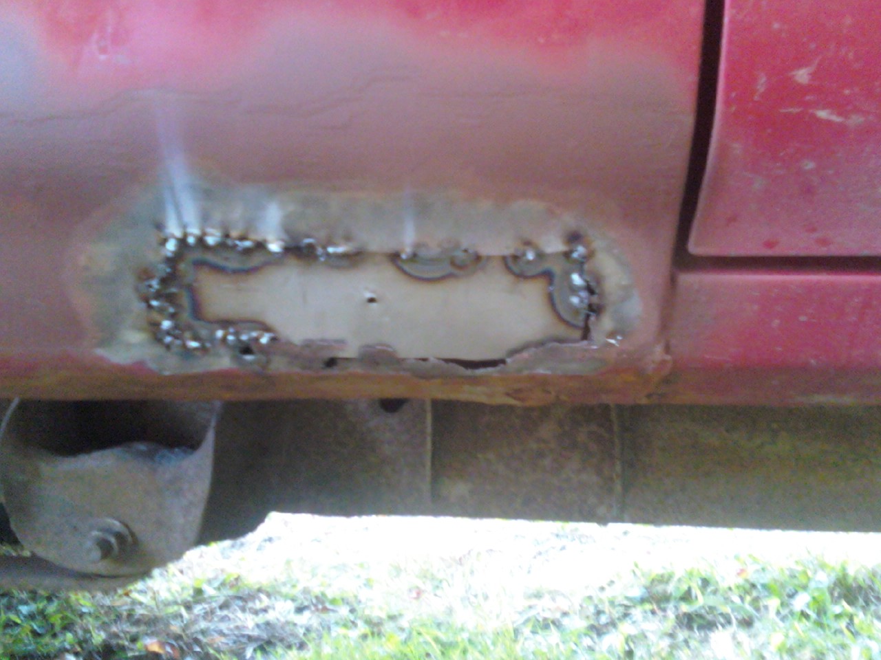 sorry about not posting in the last couple weeks so here is that I did. I got the new metal welded in where I have to cut out the junk metal. I put bondo where I put the new metal in. I also got the whole bottom of the blazer painted with the bed liner spray. I also pick up 4 235 75 15 tires for 50 bucks they are used but that's the only thing i could afforded right now. I also painted my old steel rims do to money issues so I will be holding off on new rims for now. I also towed her into the high school yesterday so they could take the old transmission out and put the new one in. they are also replacing the passenger side CV boot and seeing why my fuel gauge does not work most of the time. I hope they get it all done is 2 weeks so i can get it inspected and start to drive it. Here is some pics of what I did hope you enjoy. Also I have around 500 bucks into the old girl so I think I got a good deal.