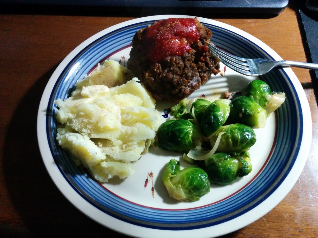 GOOD NEWS: Wife made my favorite: Home made meatloaf, mashed potatoes, and buttered brussel sprouts!