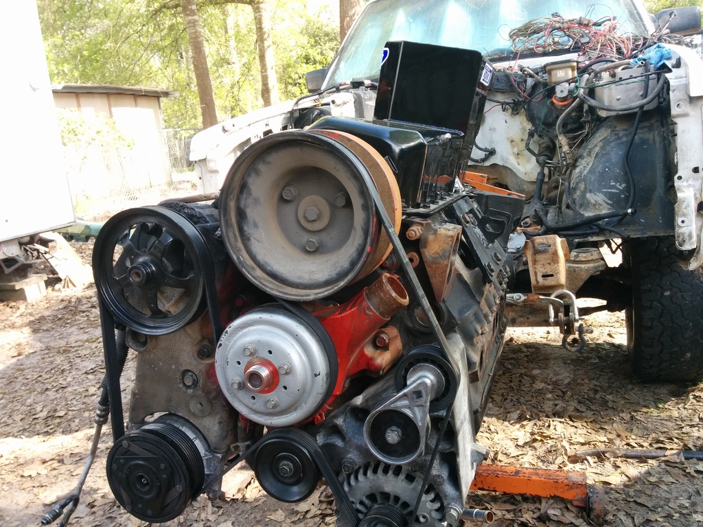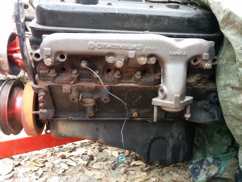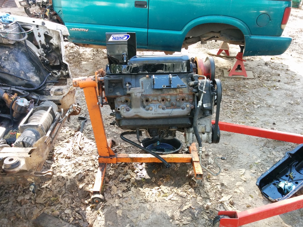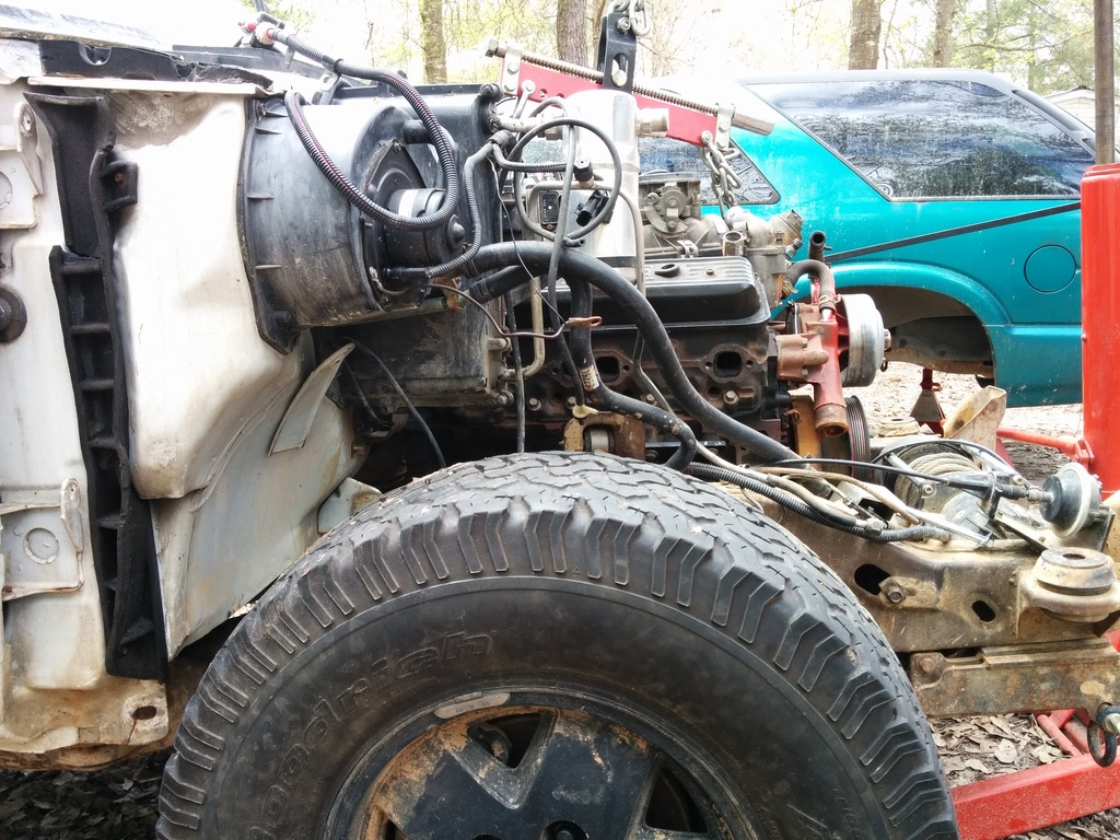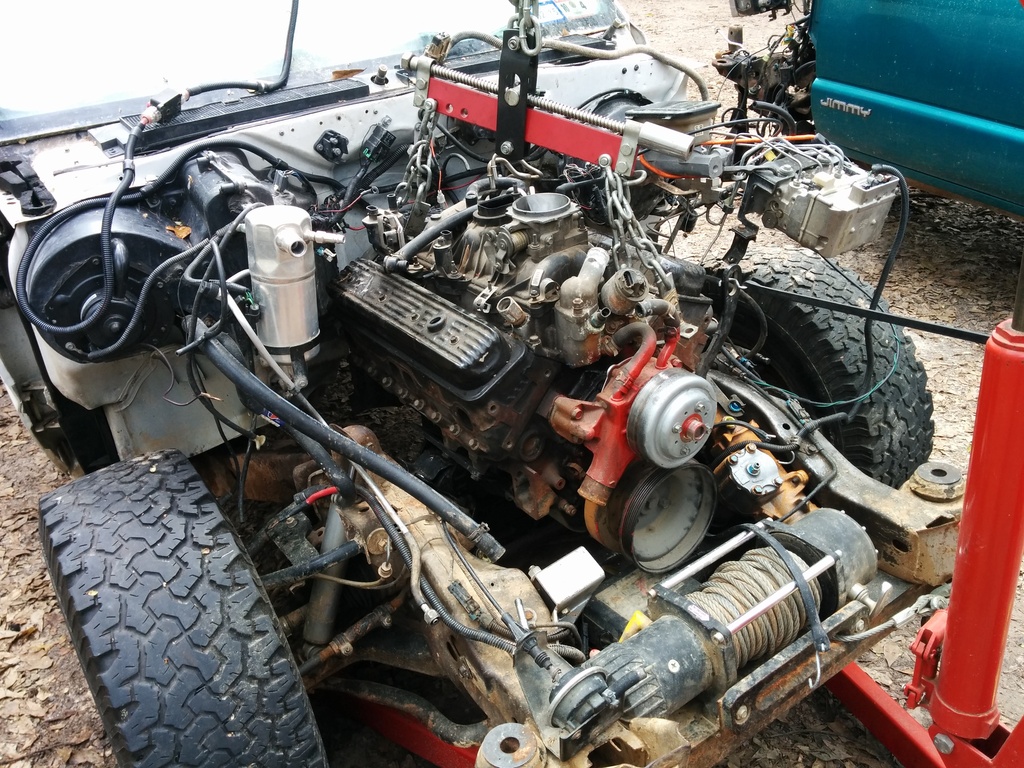 So I haven't updated despite working solid since my last post. I just got my camaro LH manifold in the mail and was test fitting the engine into the bay. I work in a sandy dirt yard and my 5 hens use the "scorched earth" method of finding snacks so it is a barren wasteland out here. I have to use my wifes tahoe to push my Jimmy forward inching it along as I work the engine into the bay.
