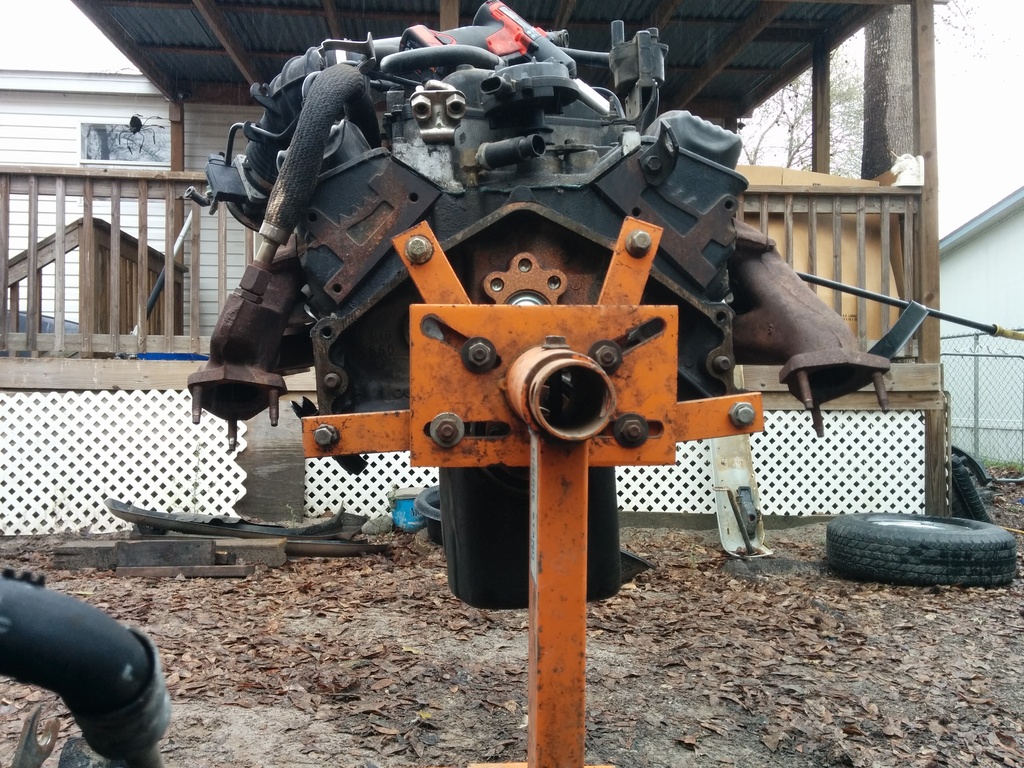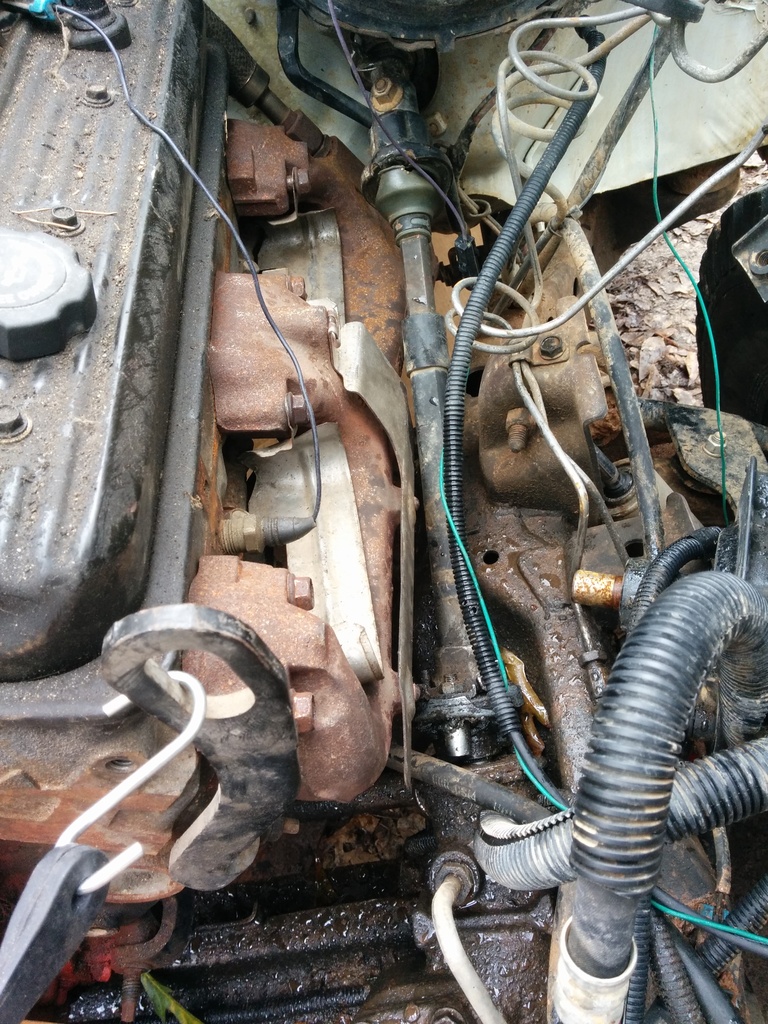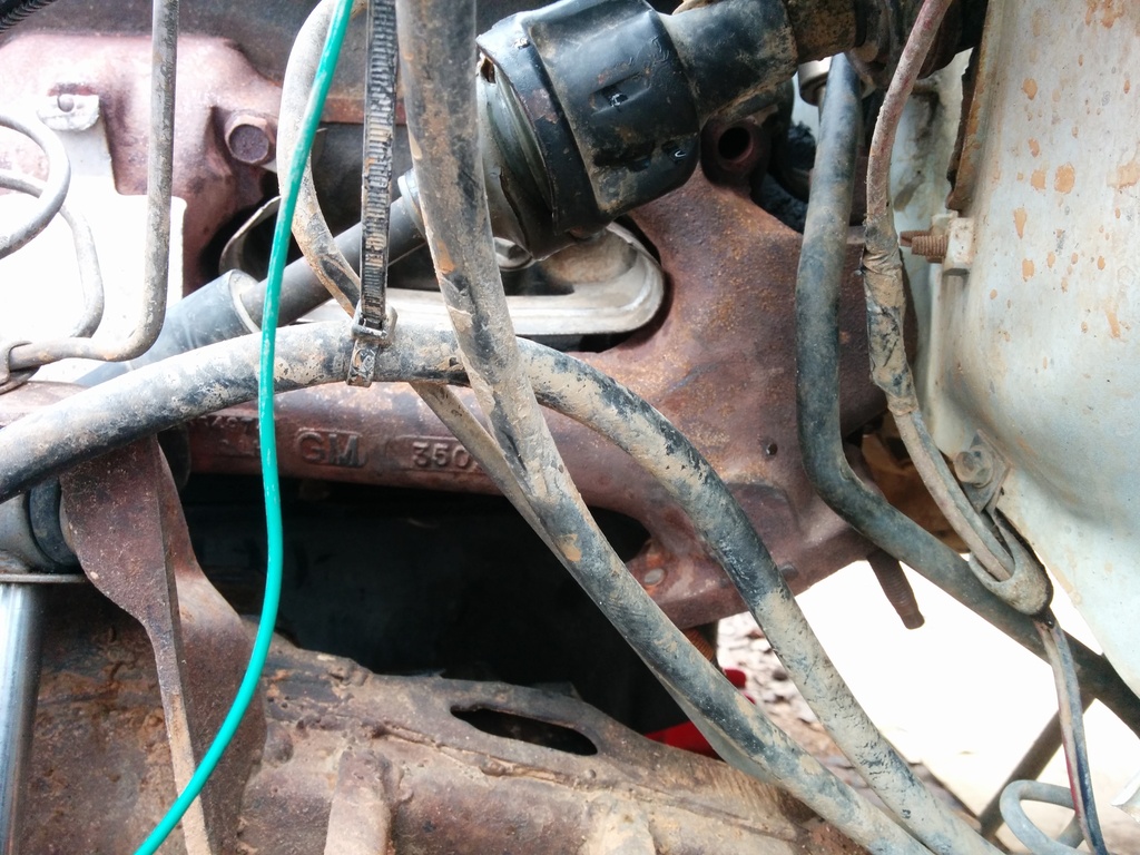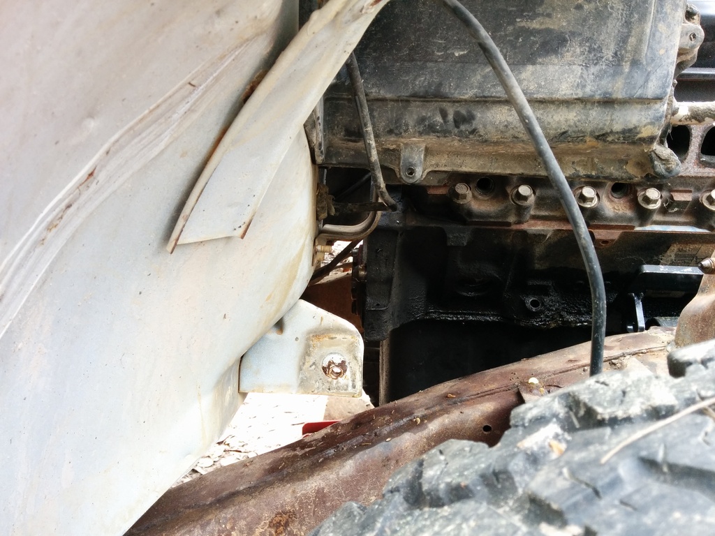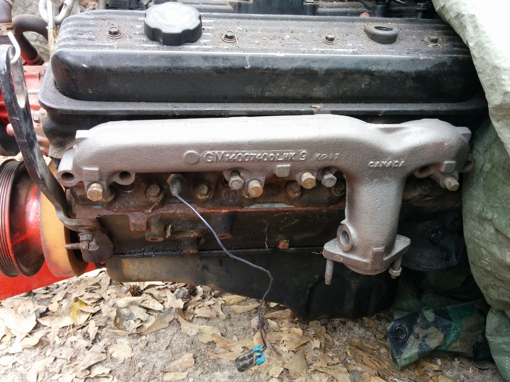 So I haven't updated despite working solid since my last post. I just got my camaro LH manifold in the mail and was test fitting the engine into the bay. I work in a sandy dirt yard and my 5 hens use the "scorched earth" method of finding snacks so it is a barren wasteland out here. I have to use my wifes tahoe to push my Jimmy forward inching it along as I work the engine into the bay.