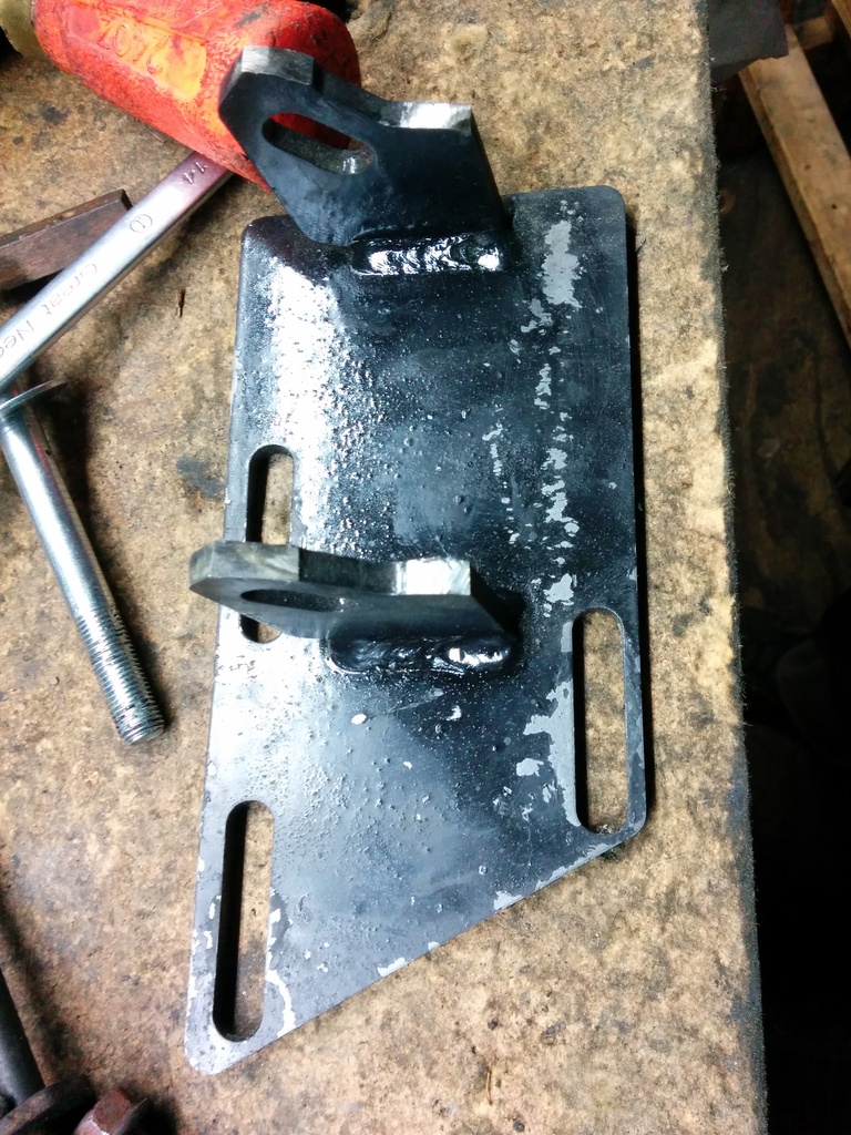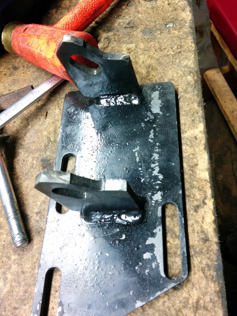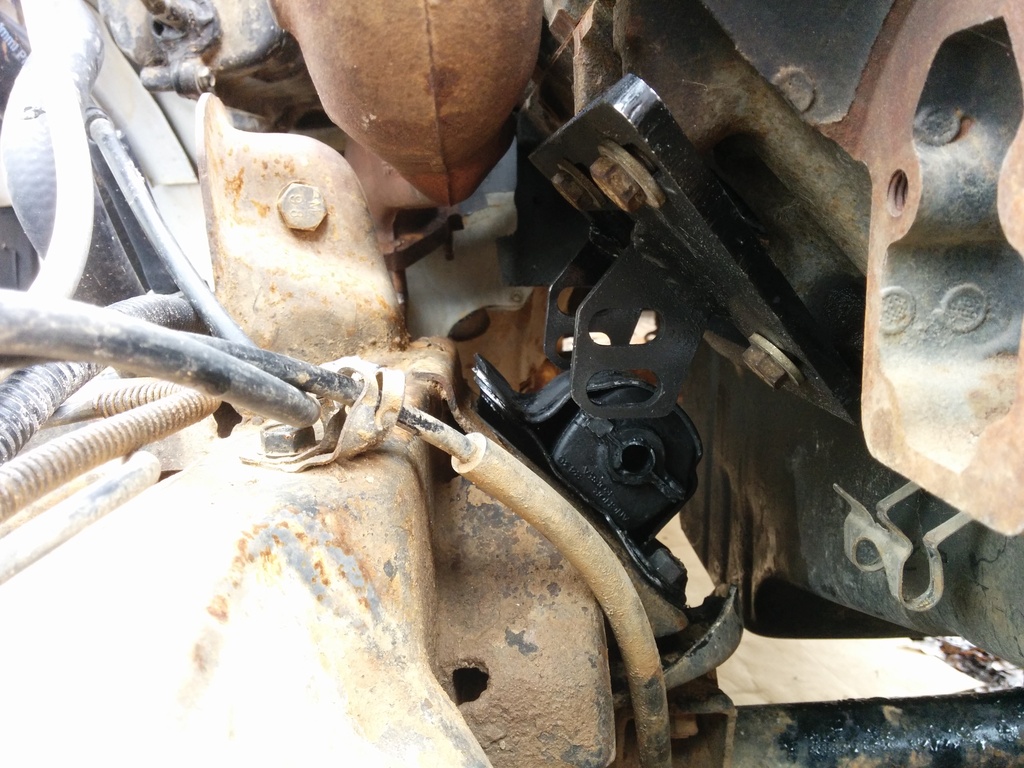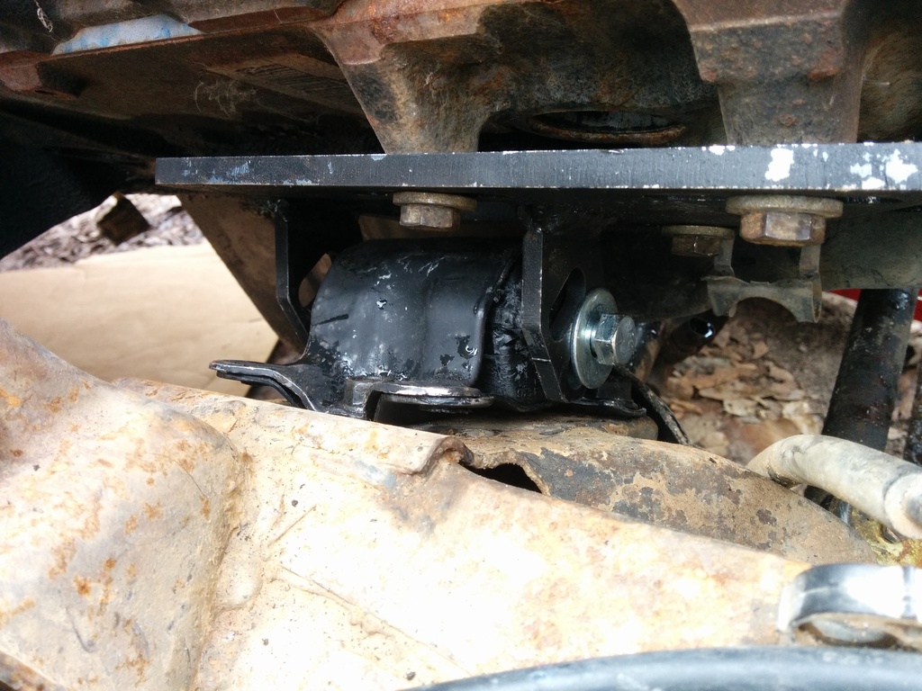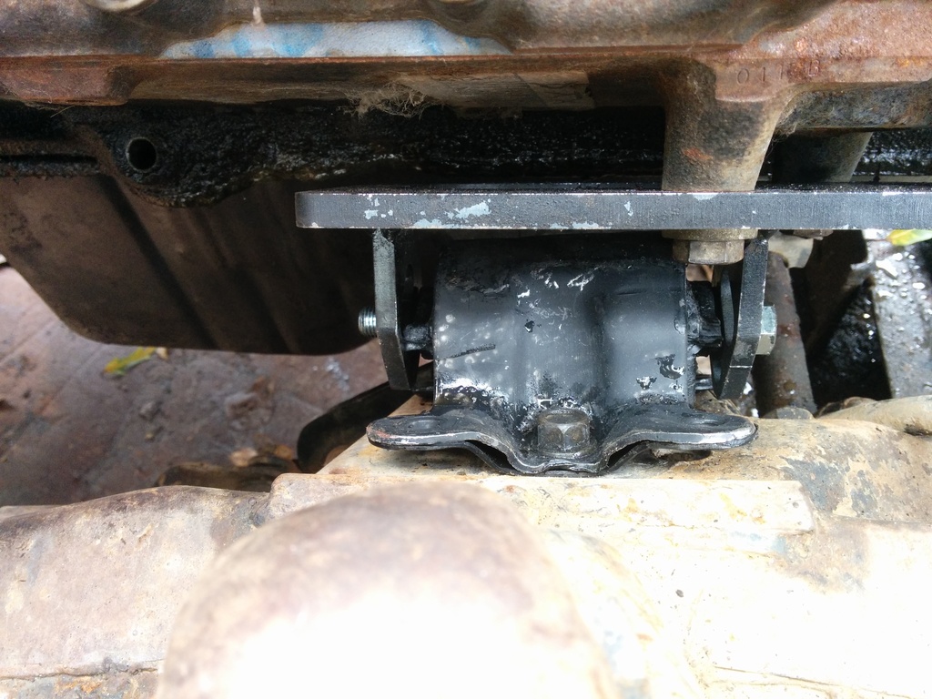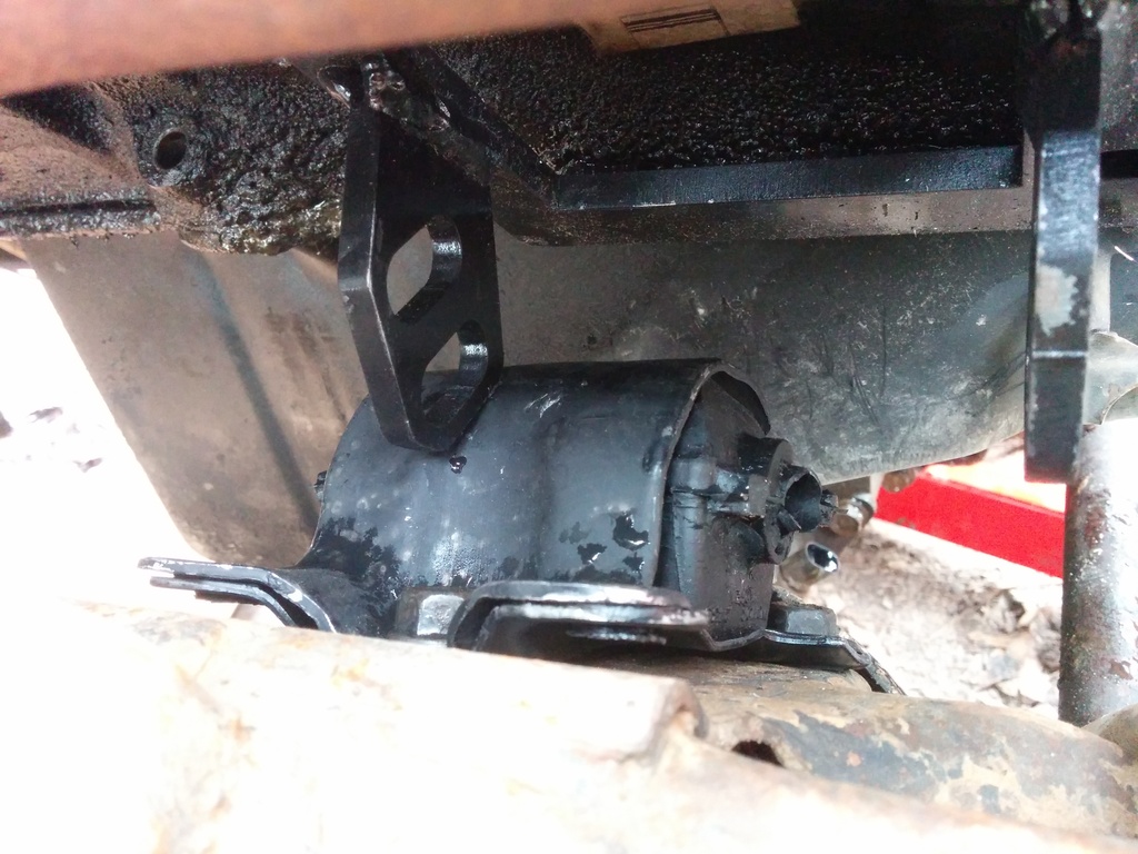 While I had my original diff removed I pulled the DS 4.3 mount and installed the 2.8 clam shells. The original bolts that hold the 4.3 mounts on are too large on the single bolt side of the 2.8 mounts so I used some slightly smaller diameter bolts I had on hand. I also can't figure out how the hell to remove the manual trans from the engine. I pulled every bell housing bolt and the trans is not moving anywhere. I left it on the jack overnight while I do research on the issue.