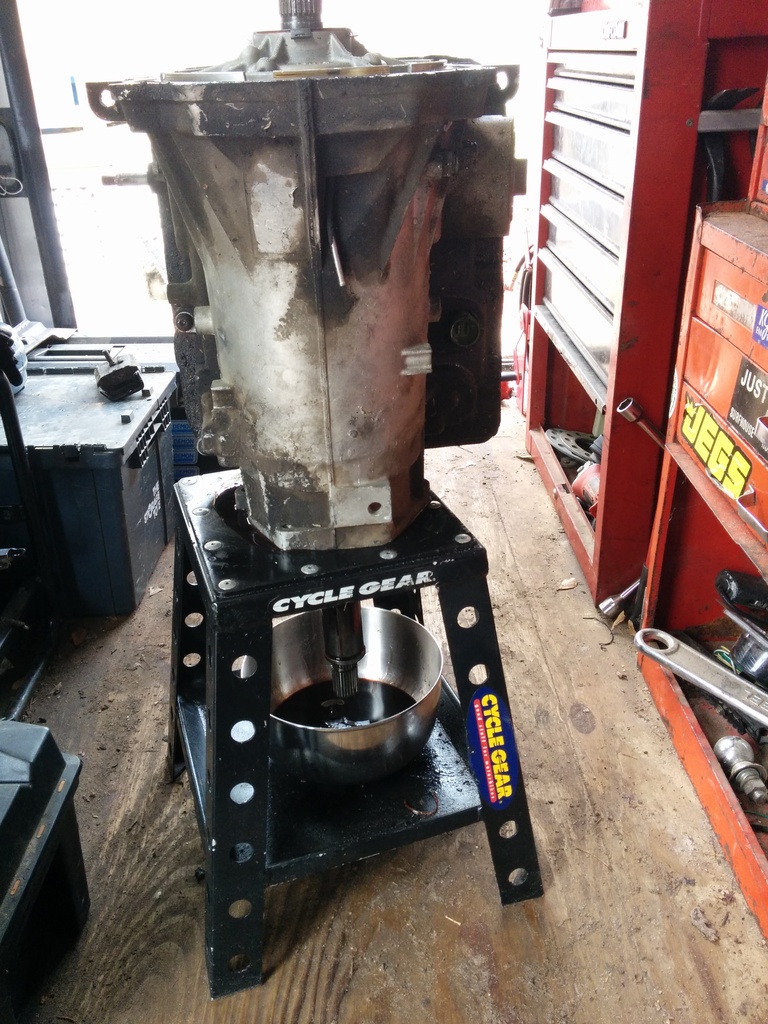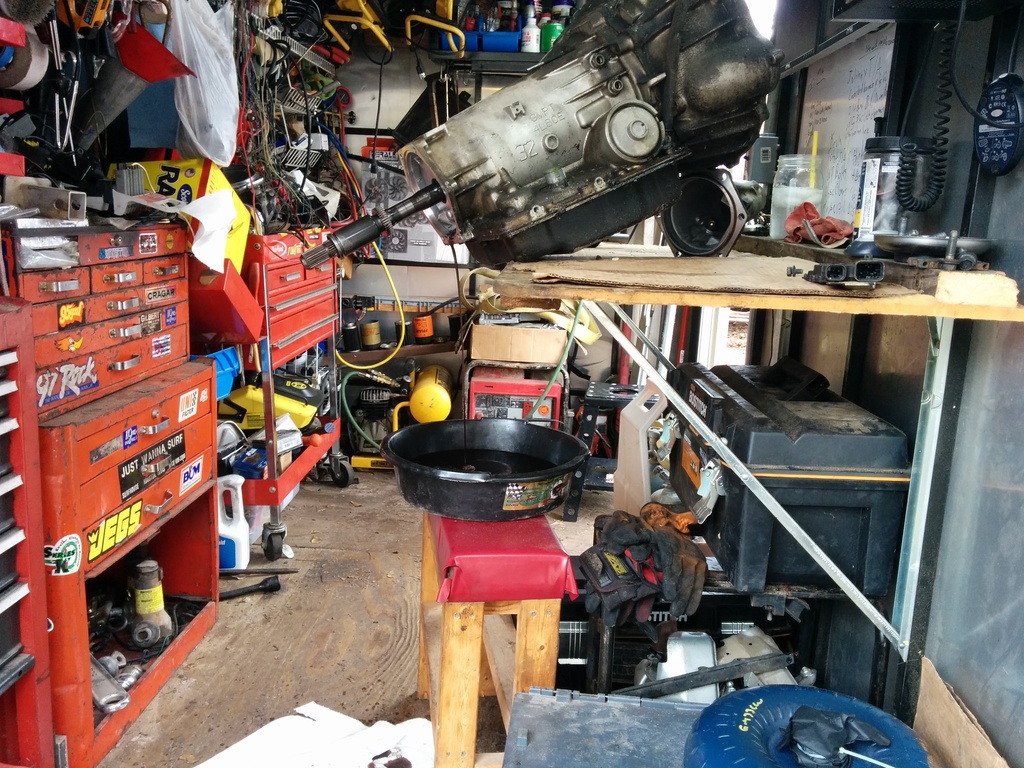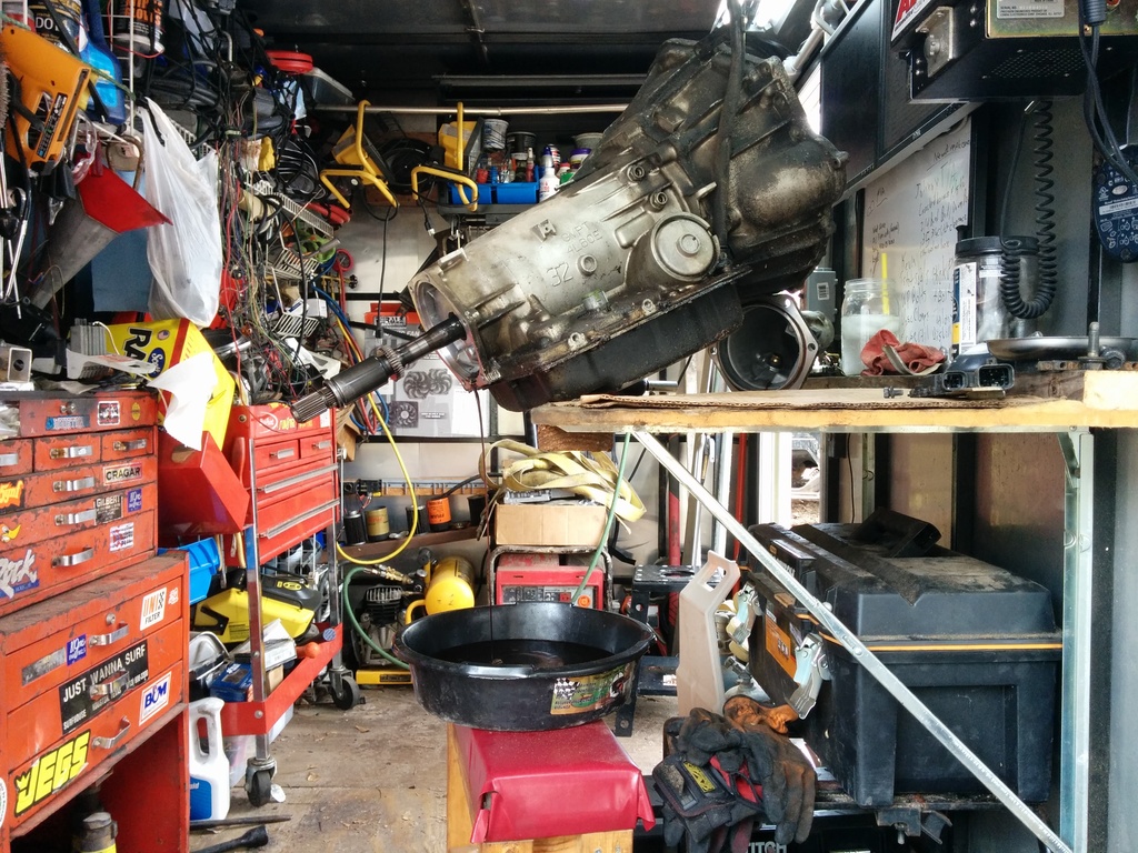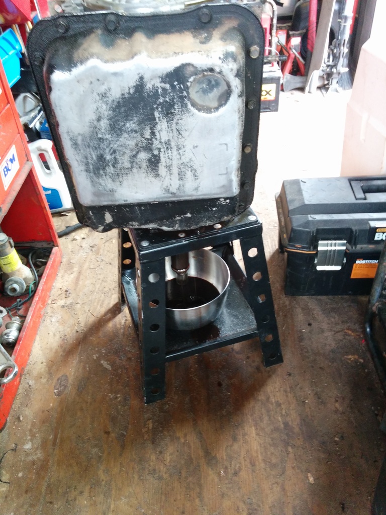 Alright, the bellhousings off, the fluids drained. Now I get out my stainless steel cookware that I paid 2 dollars for at a garage sale at my neighbors house filled with random sockets. Grab your dirt bike stand. Everyone has a dirtbike stand right? I have an awesome story behind how I got mine. I only tell that story in person though. Now, what's awesome about the dirt bike stand is it's strong as hell and has a huge hole in the middle with a shelf on the bottom for my stainless bowl to catch the 27 gallons that are about to come out. It's also deep enough to fit a 2wd shaft. Now, I'm 6'1" and 130 lbs. 4l60e's are relatively rediculously heavy. Go eat some spinach, and grab that trans, stick her output shaft into the hole. That was hard, go take a break, watch a tv show on netflix and eat lunch. Tell your wife shes a badass. She probably is.