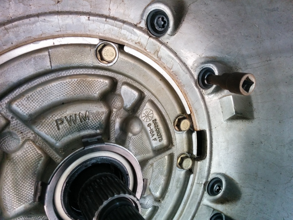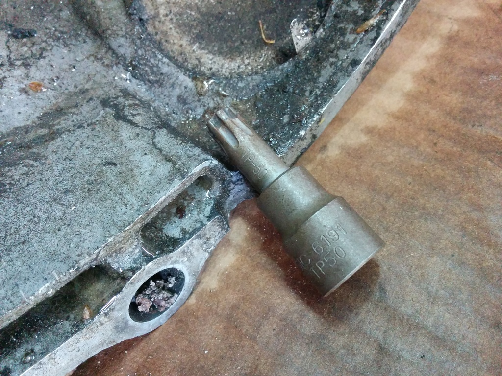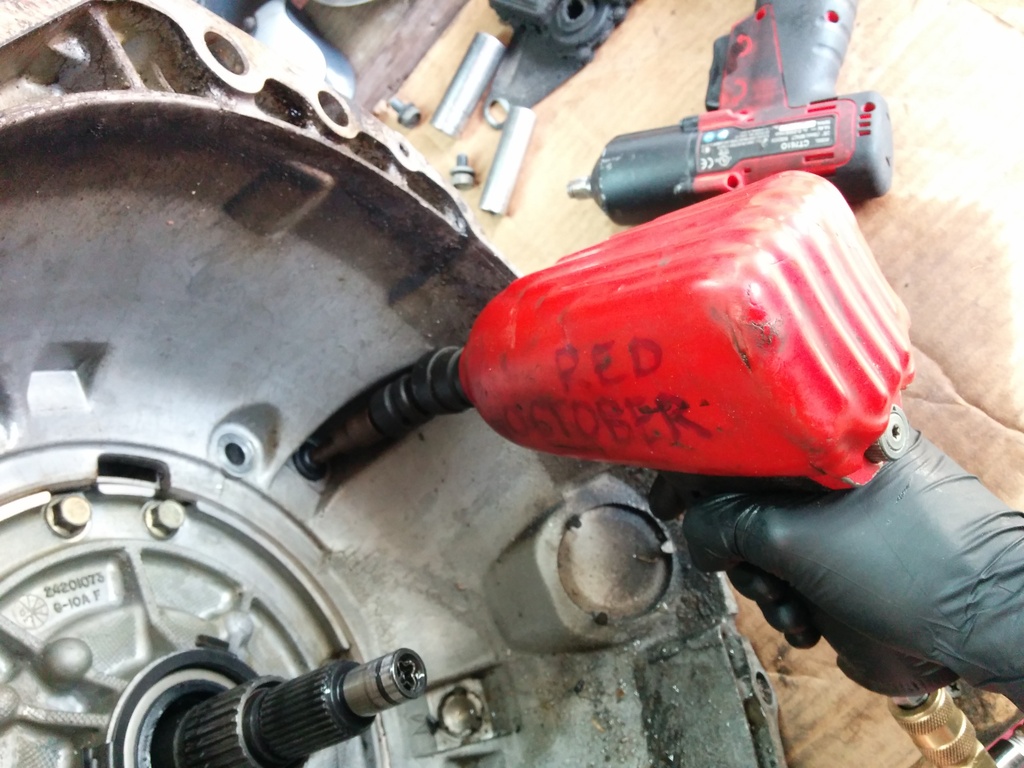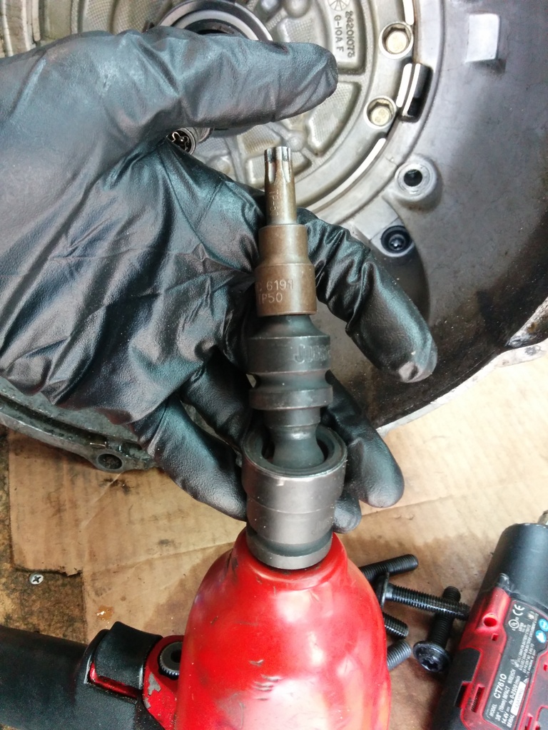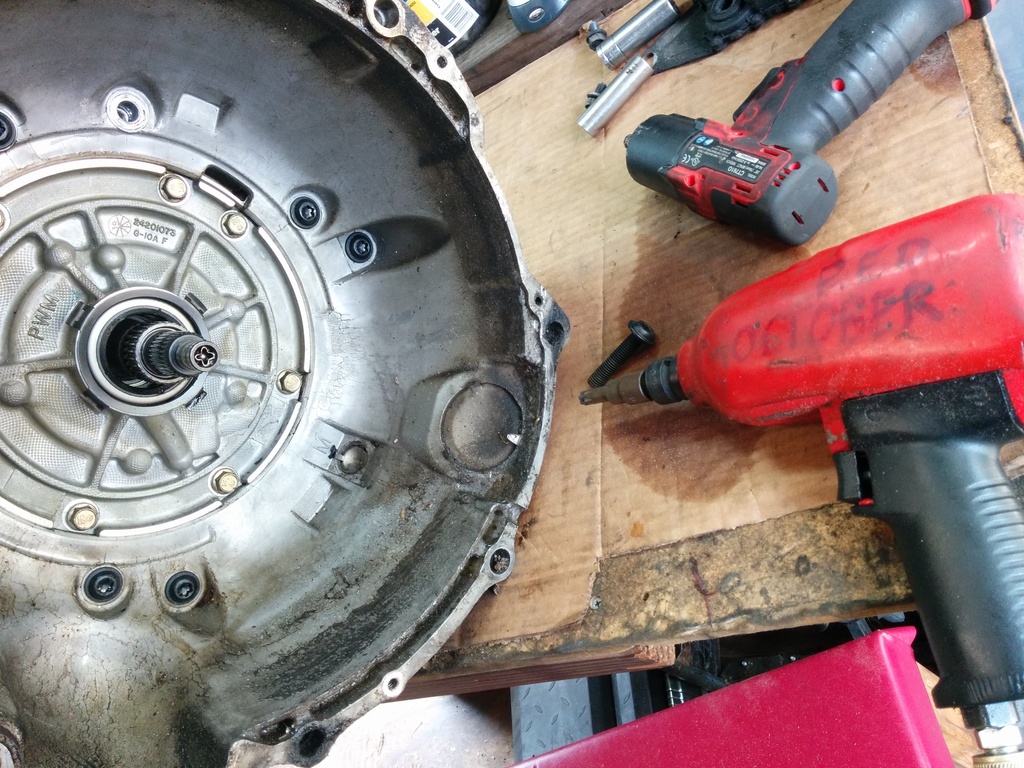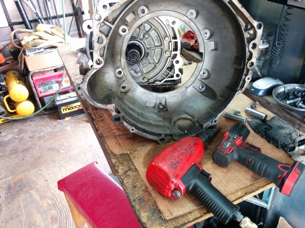 Alright, the fluids all drained out. (well not really, each component hides iirc 27 gallons per part and all you can do is get it all over your clothes and any nice tools you have around) Now because I'm fancy with a 2 piece transmission case I'm going to remove my bellhousing. The only real purpose of removing the bellhousing is because it can get in the way. My entire shop is inside of a 14 foot cargo trailer and the bell hits you in the hips when you walk by to get that damned universal socket you forgot. DO NOT USE A TORX BIT!!! It will PROBABLY destroy the bolt AND your tool. You need to buy a fancy schmancy bit called a "torx plus" and the size is a 50. Don't get a ****ty one. Get a good one, you need a good one because you need to use something similar to the Red October to remove the bolts. Electric impacts are neat and all but this is work that grows chest hair. If you carefully inspect the photos below you will see the red october with a 1/2 impact swivel from tractor supply and a 1/2 to 3/8 impact adapter coupled finally to the tp50. You will need the swivel or an extension to reach the 2 outer bolts. I'm poor and can't afford an impact extension.
