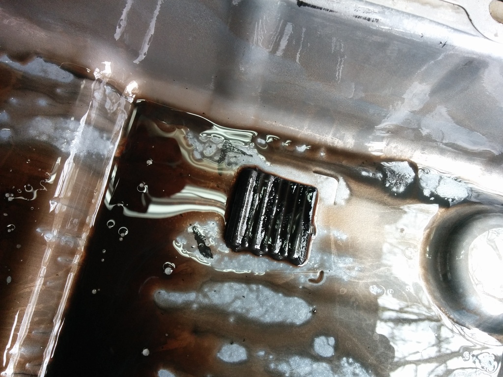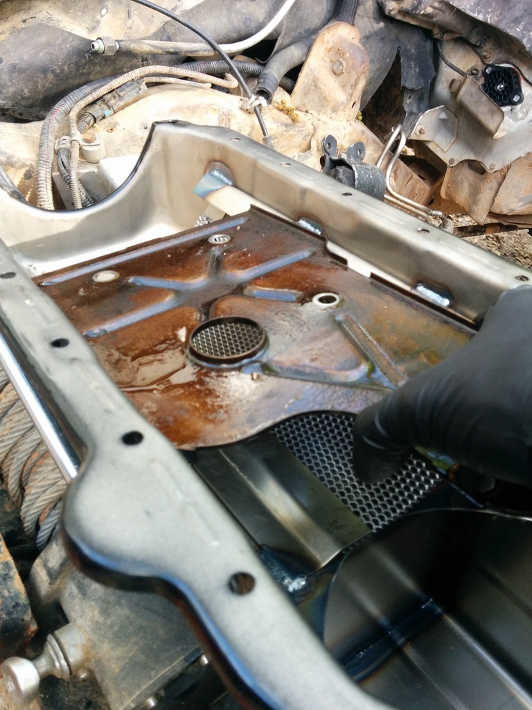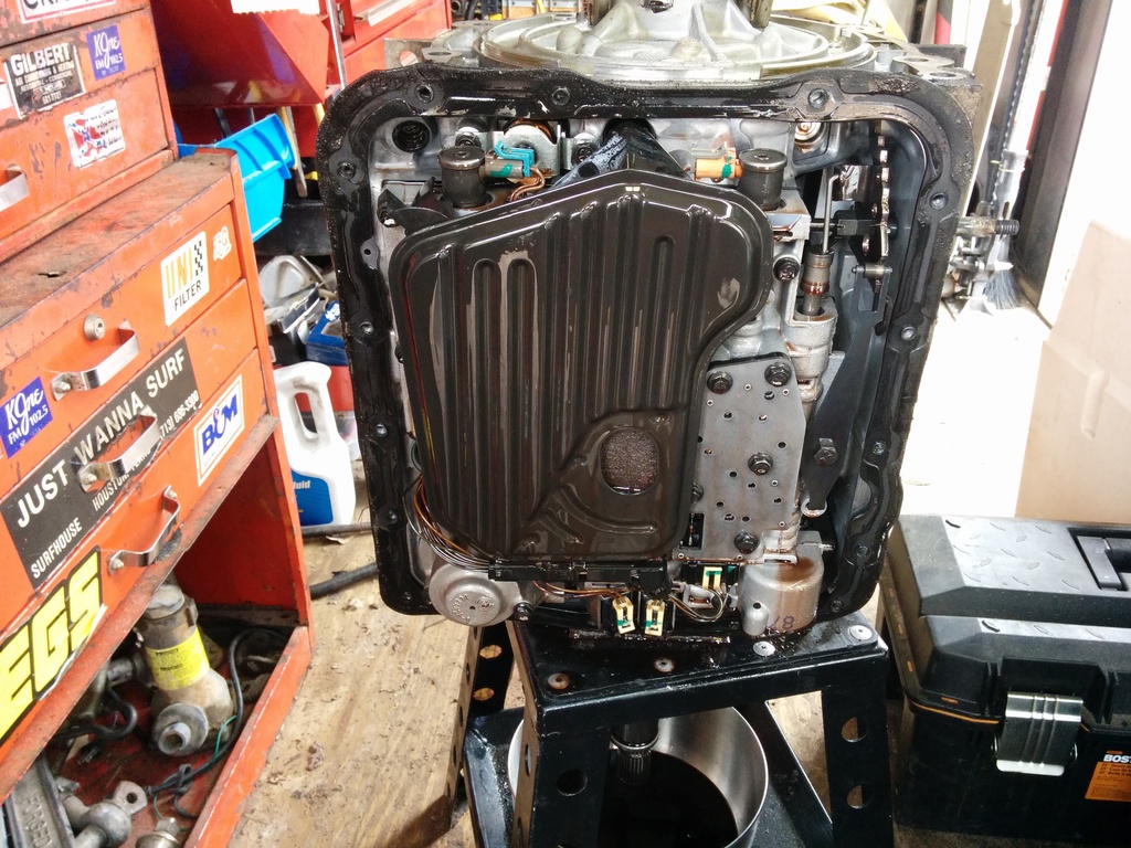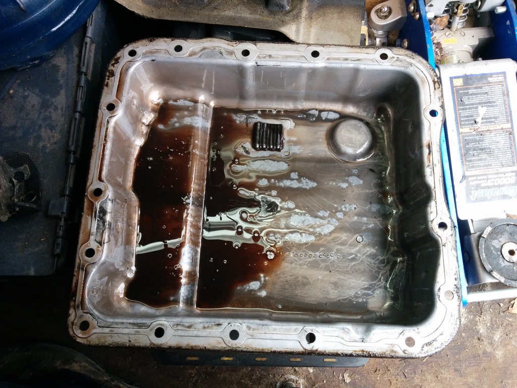 Trans is on the stand. Now it's about to look like Kill Bill in your shop. Grab that cute little 3/8 electric impact. Slap a 13mm deep on her. Pull the pan bolts. Leave the top one, yank the rest. Now keep 1 hand on the pan, 1 hand on the impact, pull the last bolt out. Drop everything on the floor. Thats usually what I do. Gently tilt the top of the pan away from the case to try and keep as many gallons of blood you can in the pan and the rest falls down on the stand and not on your brand new Vasque shoes you saved up pennies for. Stick the pan on the bench, inspect the remaining contents. The magnet is always going to be a little hairy. It's normal. Now for fluid colors. If the fluids black or purple like mine, whip out the wallet. Parts will be bad. If it's pink, you probably thought you could fix a bad trans with a fluid flush. Excellent. Whip out that wallet, and probably a credit card since you are about to drain and RECYCLE 50 bucks in fluid. You bastards better recycle. It's not hard. Now that the pans off, pull the filter and throw it in the trash. It's bad. If the pans off, the filters bad. It's physics.