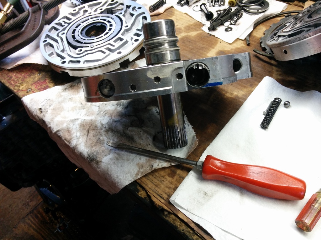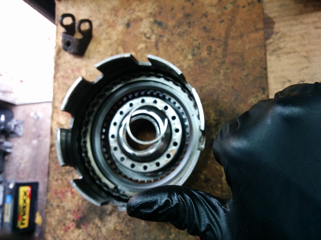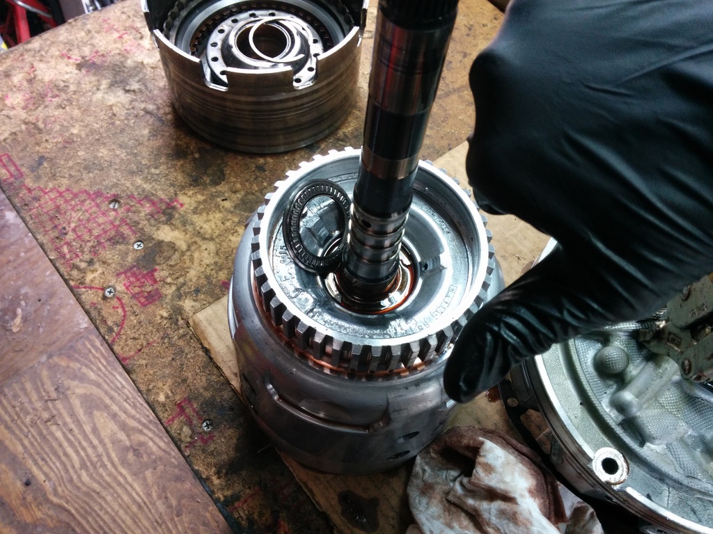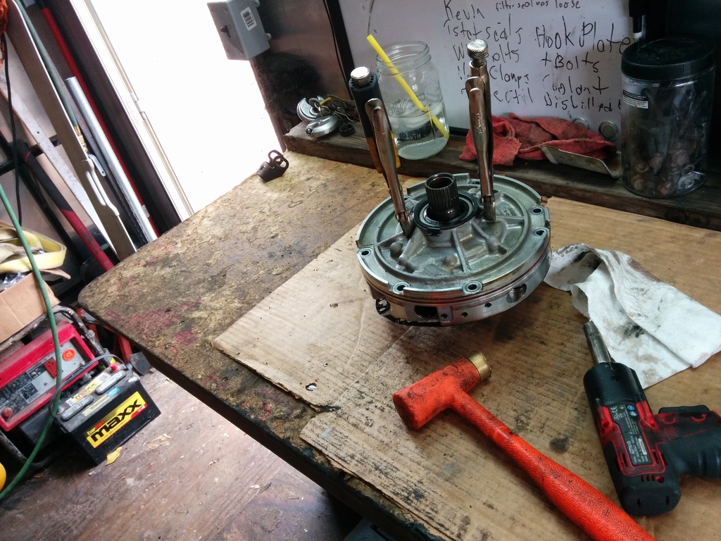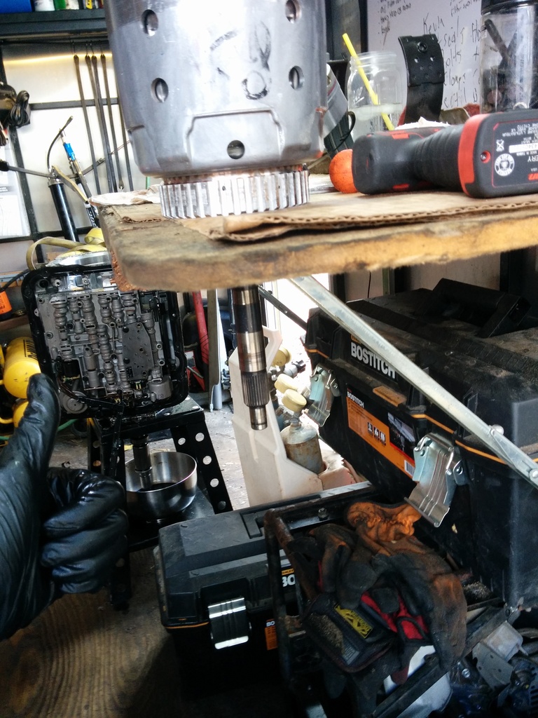 To help work on the input drum, use a paddle bit slightly larger in diameter to your input drum and drill a hole into your workbench. It's awesome. (use compressed air to clean out the assy every time you insert/remove. MDF does not belong inside of a transmission.)