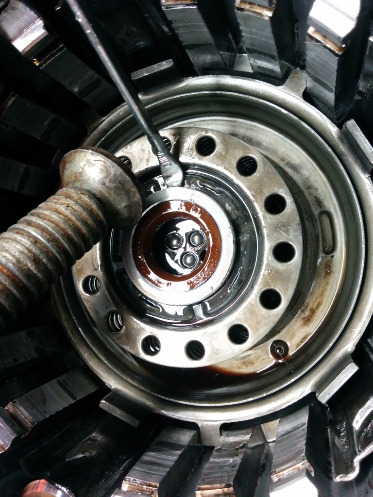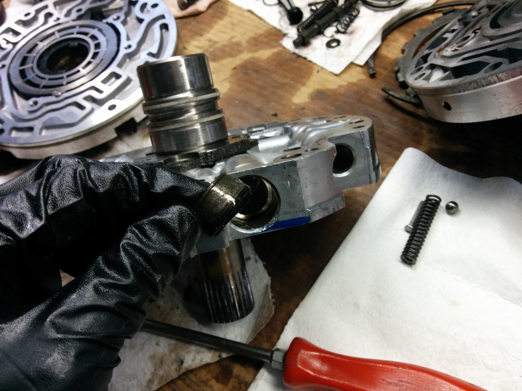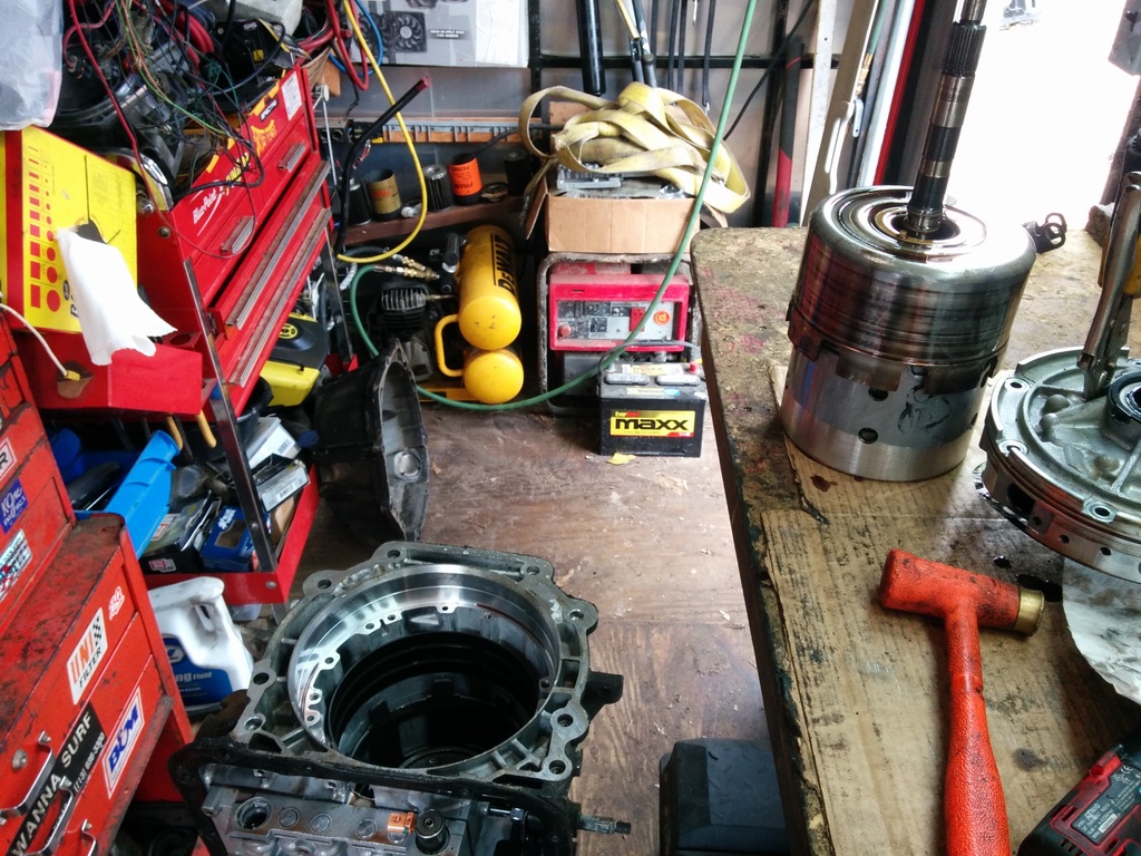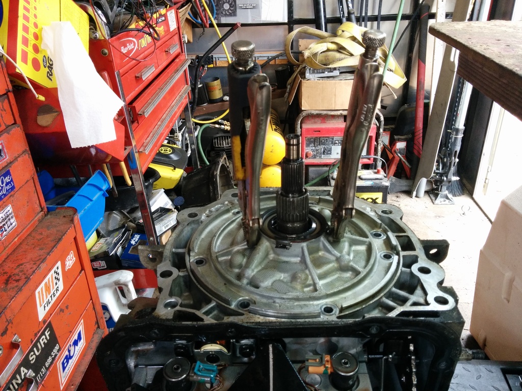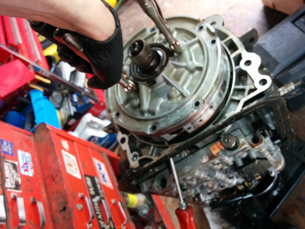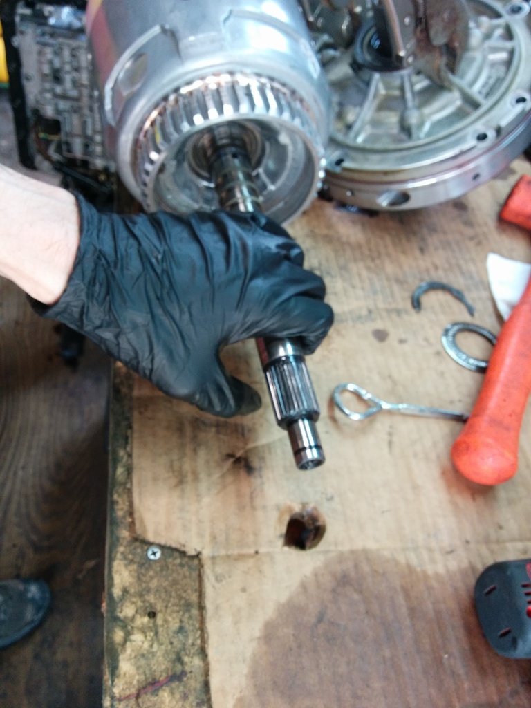 To help work on the input drum, use a paddle bit slightly larger in diameter to your input drum and drill a hole into your workbench. It's awesome. (use compressed air to clean out the assy every time you insert/remove. MDF does not belong inside of a transmission.)
