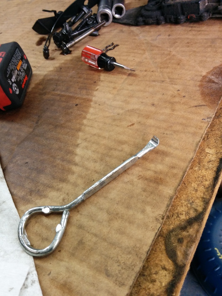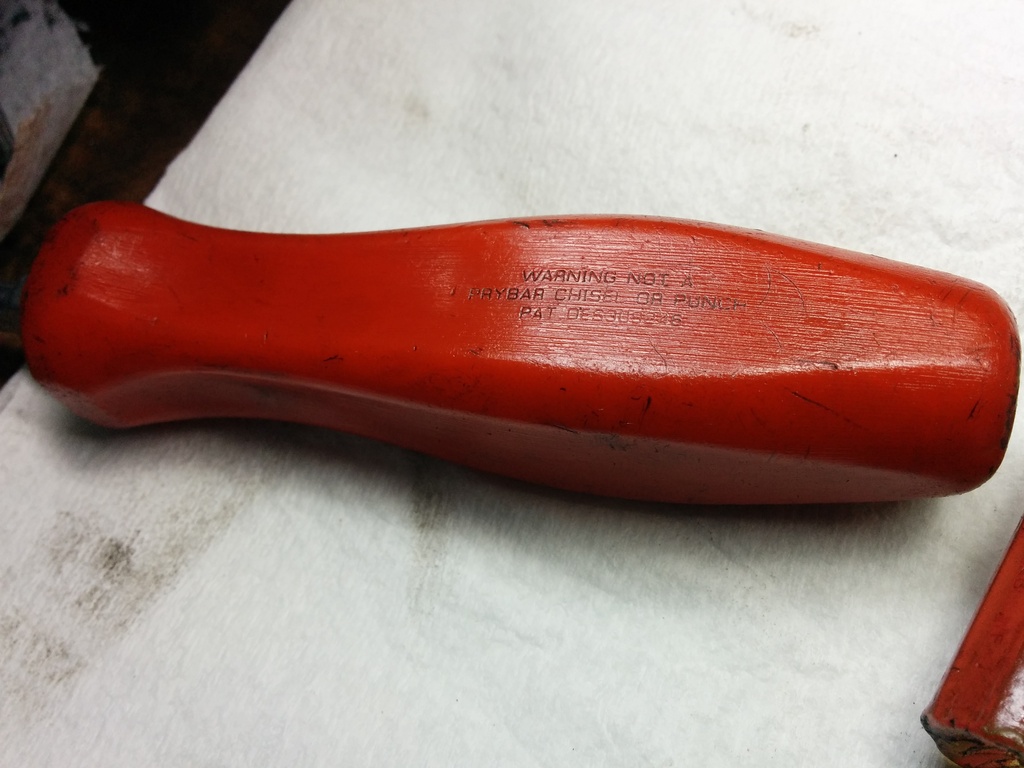Now for the pump removal. I was at the junkyard in north houston and saw this red handled screw driver on the fan shroud of a GMT400 pickup. About 30 minutes later walking by it was still there. I figured what the hell, someone forgot it. Tossed it in my bag and away I went. The red color made me think it was some cheap chinese crap but it was pretty big. My buddy is a big snap on guy and told me I found a fourty dollar screw driver. Damn good score. Stick that strapon screw driver in between the pump and the transmission and pry the pump up. It helps to have a friend pull the vice grips up while you are prying.
