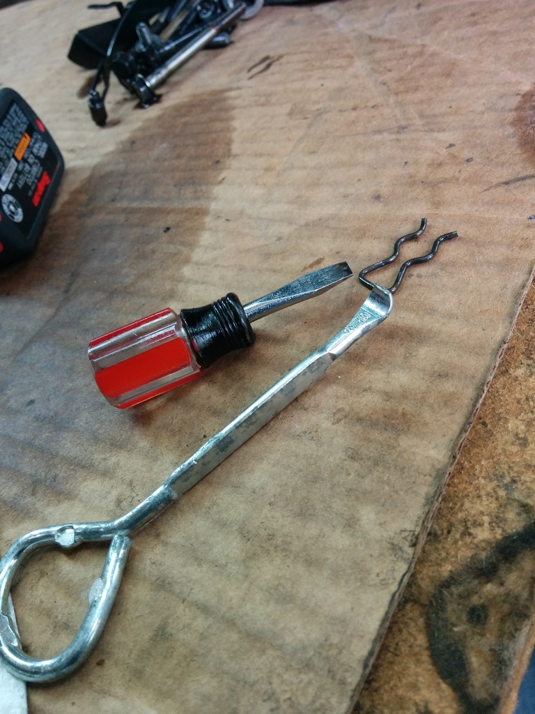 Next step, we need the harness out of the way. Namely the lockup solenoid. It's jammed into the pump. We need to remove the pump to get to the goodies. Here I've already attached my amateur hour front pump removal tool. They are Vice Grip brand vice grips. I think the generic term is "locking pliars". The pwm solenoid is in the way of removing the lockup solenoid. Theres a clippie in the channel beneath it you need to remove. I got this trick bottle cap opener but if your wife didn't find you one in the lowes parking lot then you can just use a regular flathead screwdriver. If you can't see the clip, spin the solenoid around right round like a record. Use a flashlight. 2 10mm bolts hold the lockup solenoid into the pump. If the electrical harness clippies break off, go buy a brand new harness. The plastic was cooked. Not a bad time to install a trans cooler too.