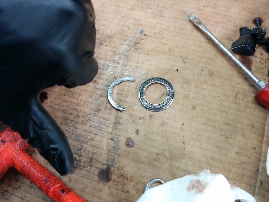 Alright, the pumps on the bench, lets pop the band anchor pin off of the band with that free strapon screw driver. This opens up the band so you can pull the drum clean out of the case. I wasn't thumbing for a ride, the image needs to rotate 90* anticlockwise. Strange things started happening tearing into this trans. First part:when you remove the reverse input drum, a snap ring shouldn't fall out onto the bench. Mines probably ruined.