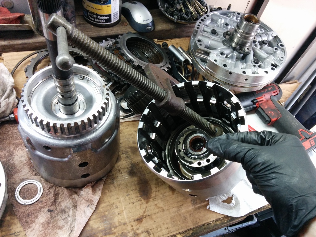 Using my parking lot snap ring assist tool and some large c clamps I removed the input drum snap ring holding 1 of 3 springs of death in place.