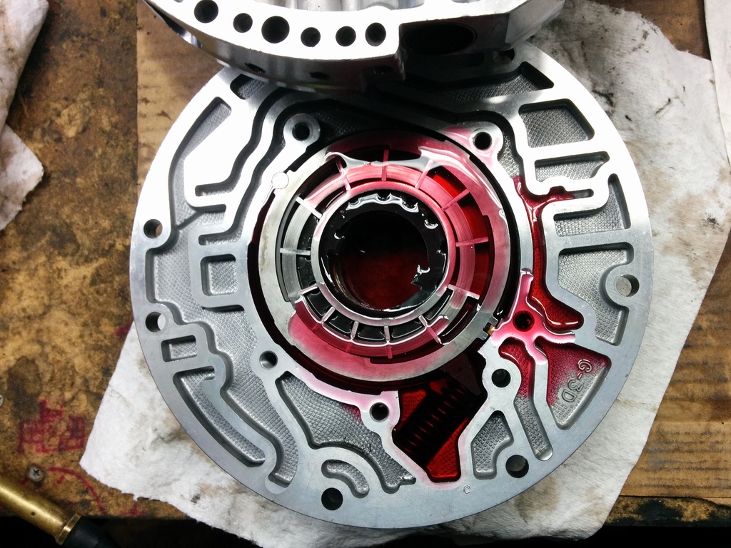 Now we get into the front pump. The goal here is to check the beating heart of the trans. Make sure the pump is not more than 1 piece. Also read the manual. Theres measurements to be taken with a straight edge and feeler gauges. My pump was trashed. It looked like someone put ooh I dunno, half of a thrust washer into it. Aluminum always loses. This put me in a tricky dilemma. My donor rebuilt trans is of a 1994 vintage and lacks the PWM pump I need for the 99. Now I do have a 96 pwm pump spare so I cracked her open and what do I find? It's a 10 vane. Damn. Heres where features erode function. The 13 vane is allegedly weaker than the 10 vane pump. I'm told the 13vane is done because of the hella fancy lockup strategy the 98+ uses. It essentially is never in full lockup I suppose you get a smoother flow of fluid with the higher volume of vanes. So an analogy: 4l60e and 700r4 lockup until 1995 was like a standard light switch. Lockup on or lockup off. Then GM designed this failure prone mechanism called "pwm". It works more like a dimmer switch. Theres on/off and theres the in between stuffs. This is supposed to keep you in lockup longer, keep the trans temps lower, and save fuel economy at the expense of lockup converter fatigue.