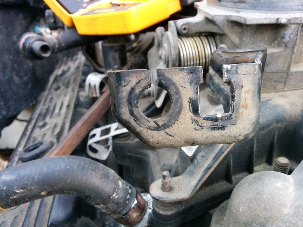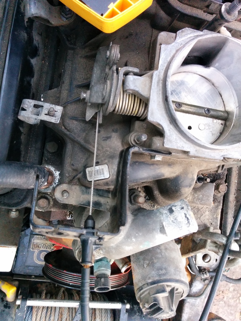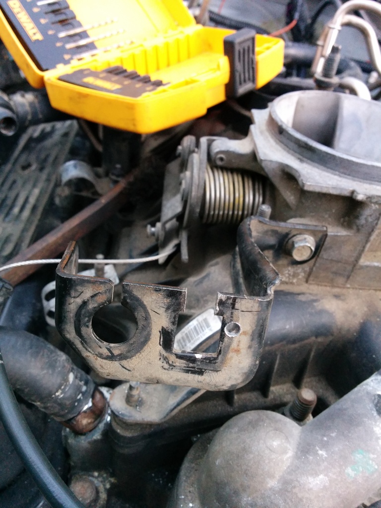 Ran my stock 4.3 cpi throttle cable to the v8 intake using the v8 intake throttle cable assy. Pretty simple mod to get r done. Used my grinder, until the slit cleared the plastic snap. Once that was done I used a sharpie to drill the plastic snap piece that locks it into place. Used a 1/8 bit as a pilot hole because I broke the tip off of my 5/32 bit that matched the size of the plastic snap lock thing. Slid it into place and it locked perfectly. My cable was in the truck when I bought it at 150K It's got 273k and I've not replaced it. It probably has some stretch about it. Which makes the fit PERFECT. Any looser and I'd have to mangle the bracket to lengthen up the cable which sounds not fun. The throttle pedal feels perfect throughout her travel from 0-100% verified with wife in the drivers seat.