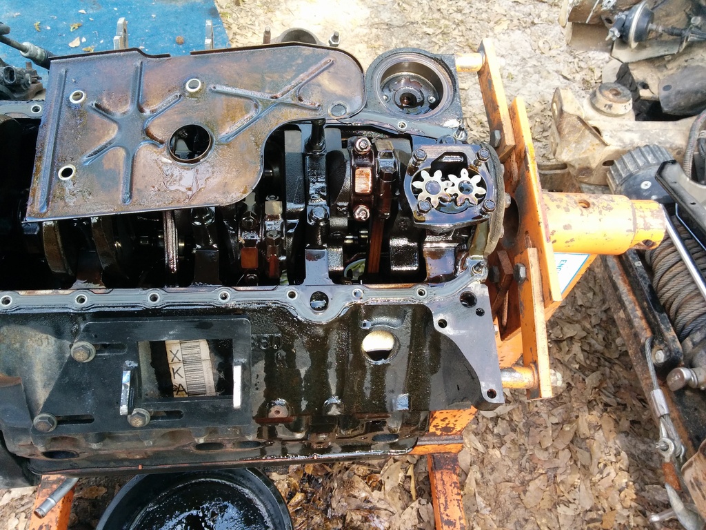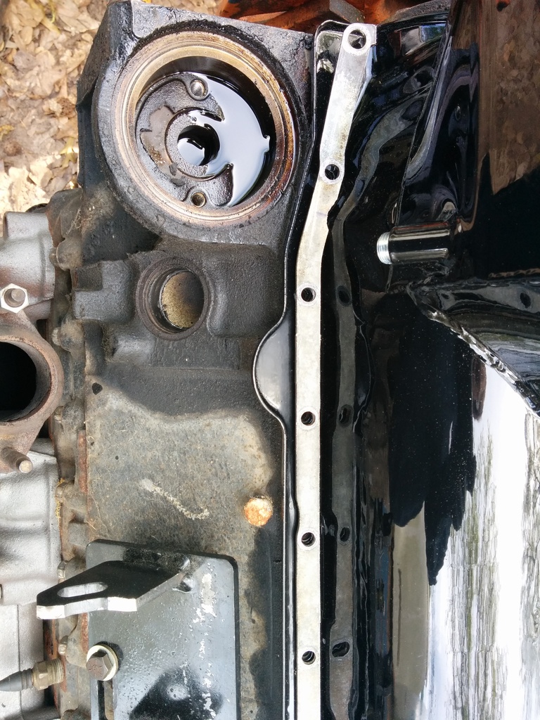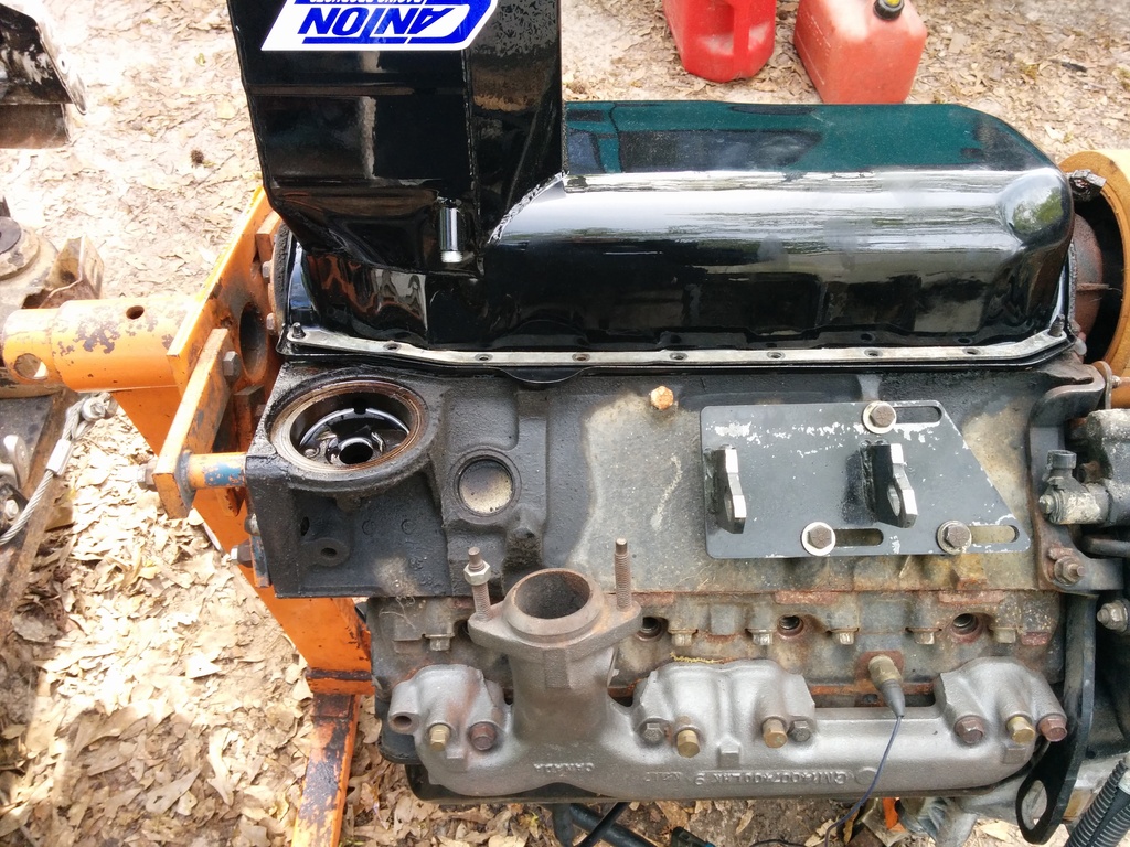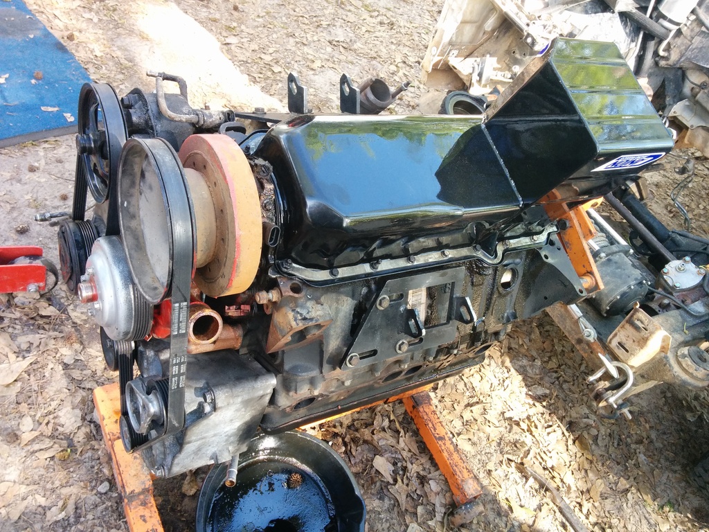 I then mocked up the engine mounts better. The oil pan does not clear my front diff despite having the rough country 2.5" lift. Even at the top mounts the pan interferes. If you were to have a v8 mount which looks to me like another .5 to 1 inch of clearance I doubt you would clear the diff. I'm just going to have to buy the canton pan. My front timing cover and pan gasket obviously leak already so there is that.