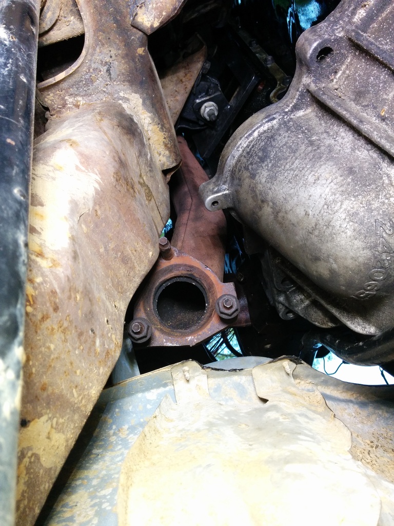 The donor sitting outside on the ground where I left her the day she was pulled. Leaving in the dipstick tube and converter keeps almost all of the water out. The tailshaft is still an open cavity but I saw no water in there when I drained everything.