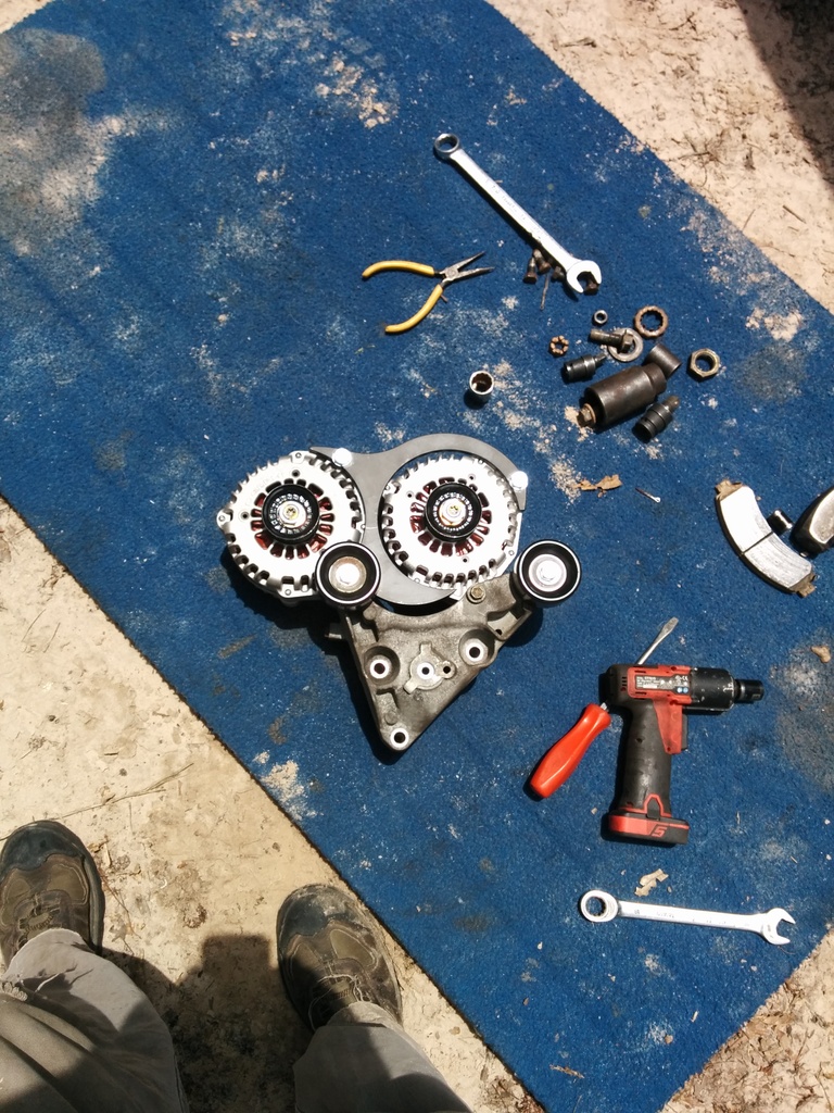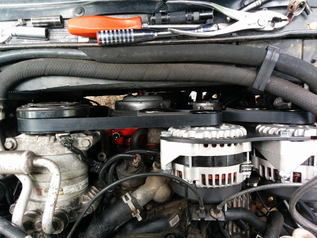 The second pulley has a long bolt, it replaces your left hand stock alternator mounting bolt. The stock alternator pivots left on the stock mount until it's sideways. The other alternator bolts on it's left mount on the right hand side of the bracket. Now both alternators have one bolt into the vehicles mounting bracket. Then the bracket that holds the 2 together goes on.