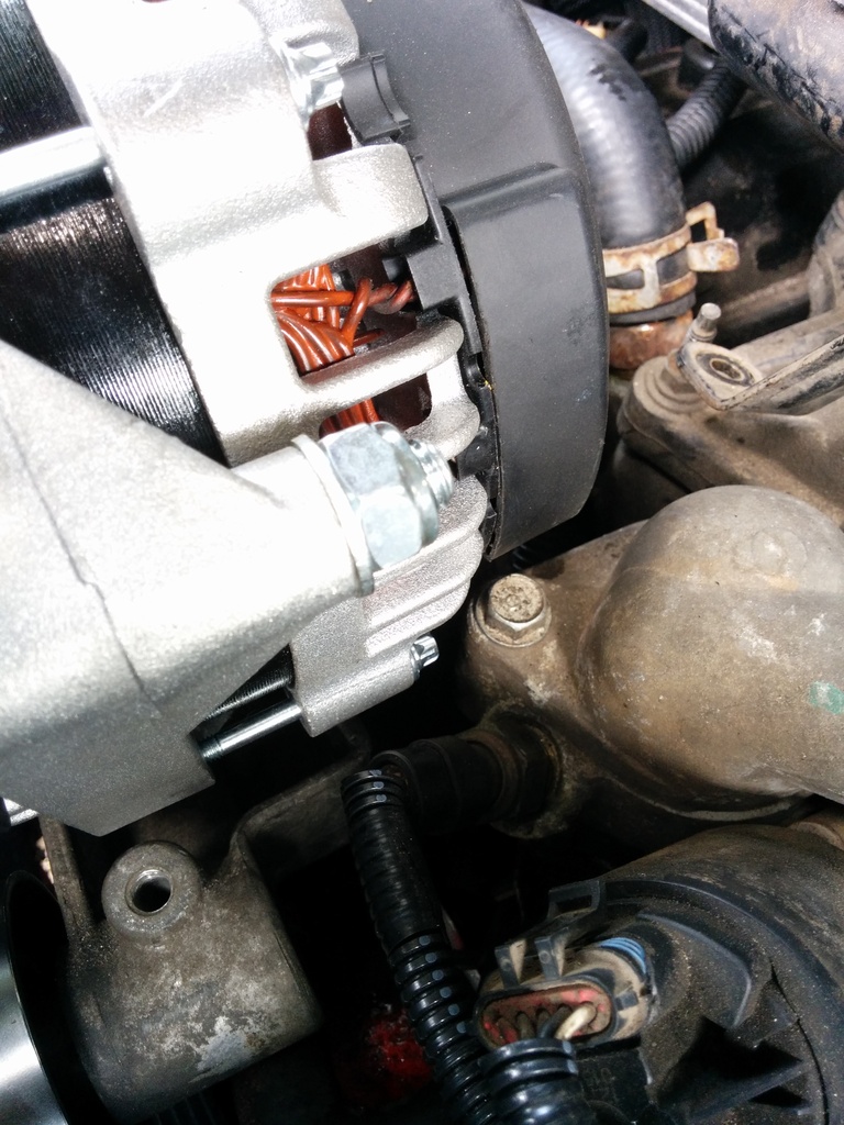 This picture shows how you must align the tips of the alternator case bolts against the edges of the bracket. This keeps the alternators from twisting left or right.
