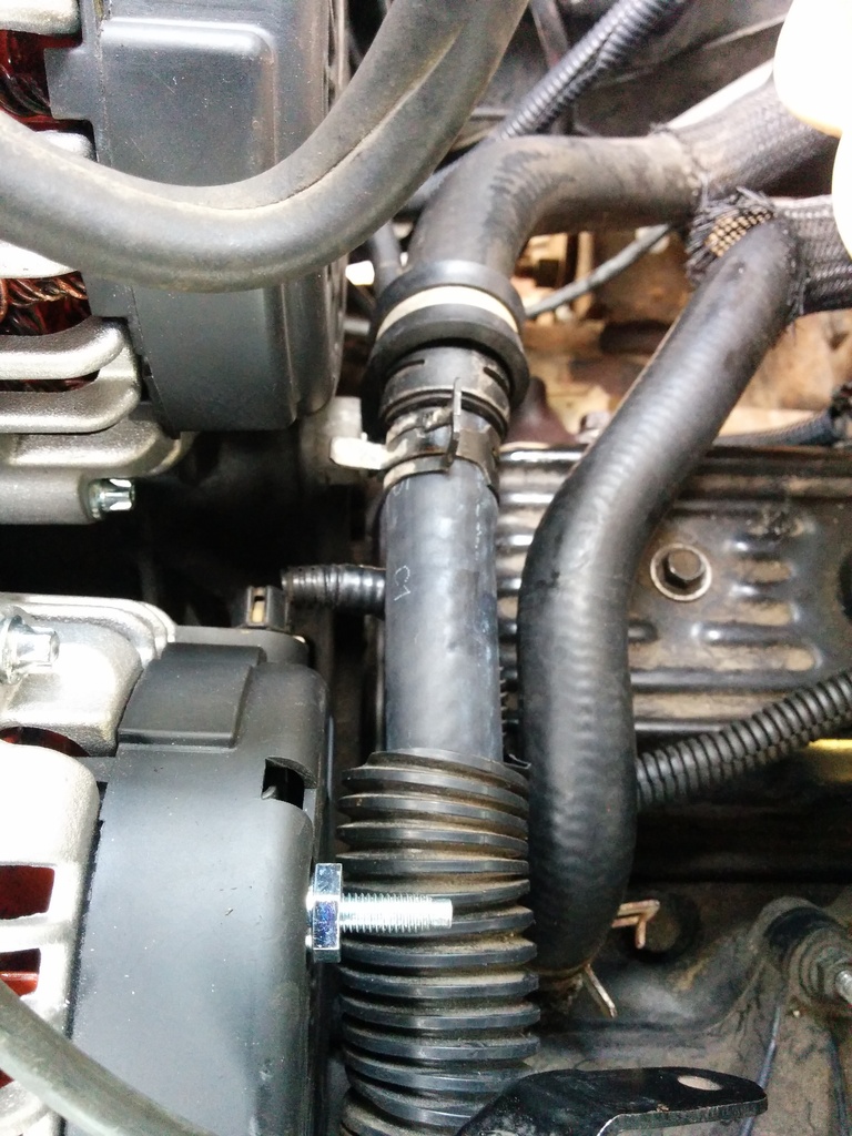 Used a clamp to securely locate the heater hose to the alternator bracket on the backside. I also used some old electrical loom and fed the hose between the throttle bracket and alternator. Ideally I'd use some of the nylon mesh but I'm fresh out.