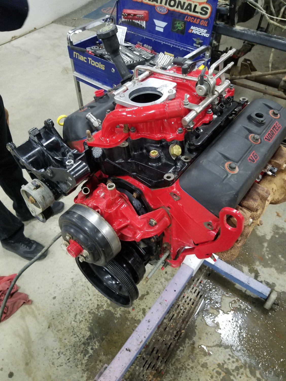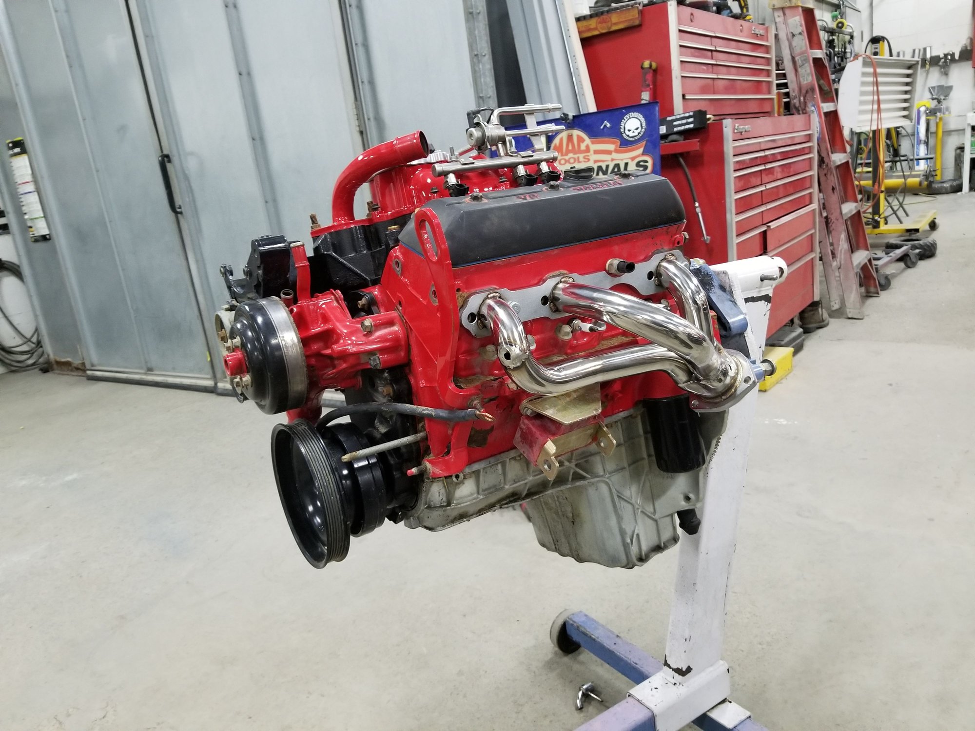 Pulled the motor, it's getting an oil leak fixed from in between the timing chain cover and oil pan. Also ordered a set of stainless headers for it.