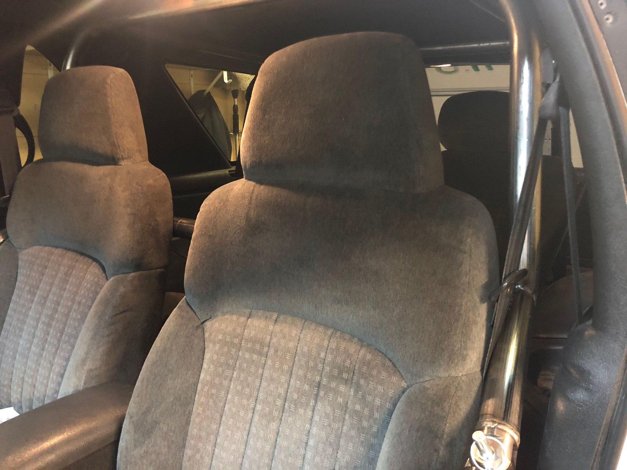 Now I'm sure you know that you will still need to have a racing harness to be legal. Could be a problem with the stock seats unless you do something like I did (photo far below). I recovered mine and installed plastic ports for the shoulder harness in the driver's seat. There is a metal plate that you need to cut through when installing the ports, so you have to remove the upholstery. The ports are two piece. One piece in from the back and one in from the front - then you epoxy or otherwise glue them together to fit your seat thickness.