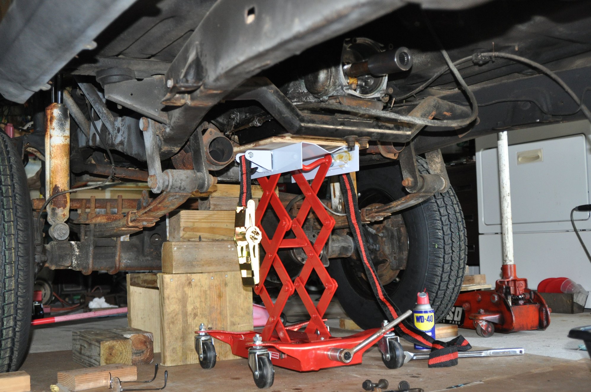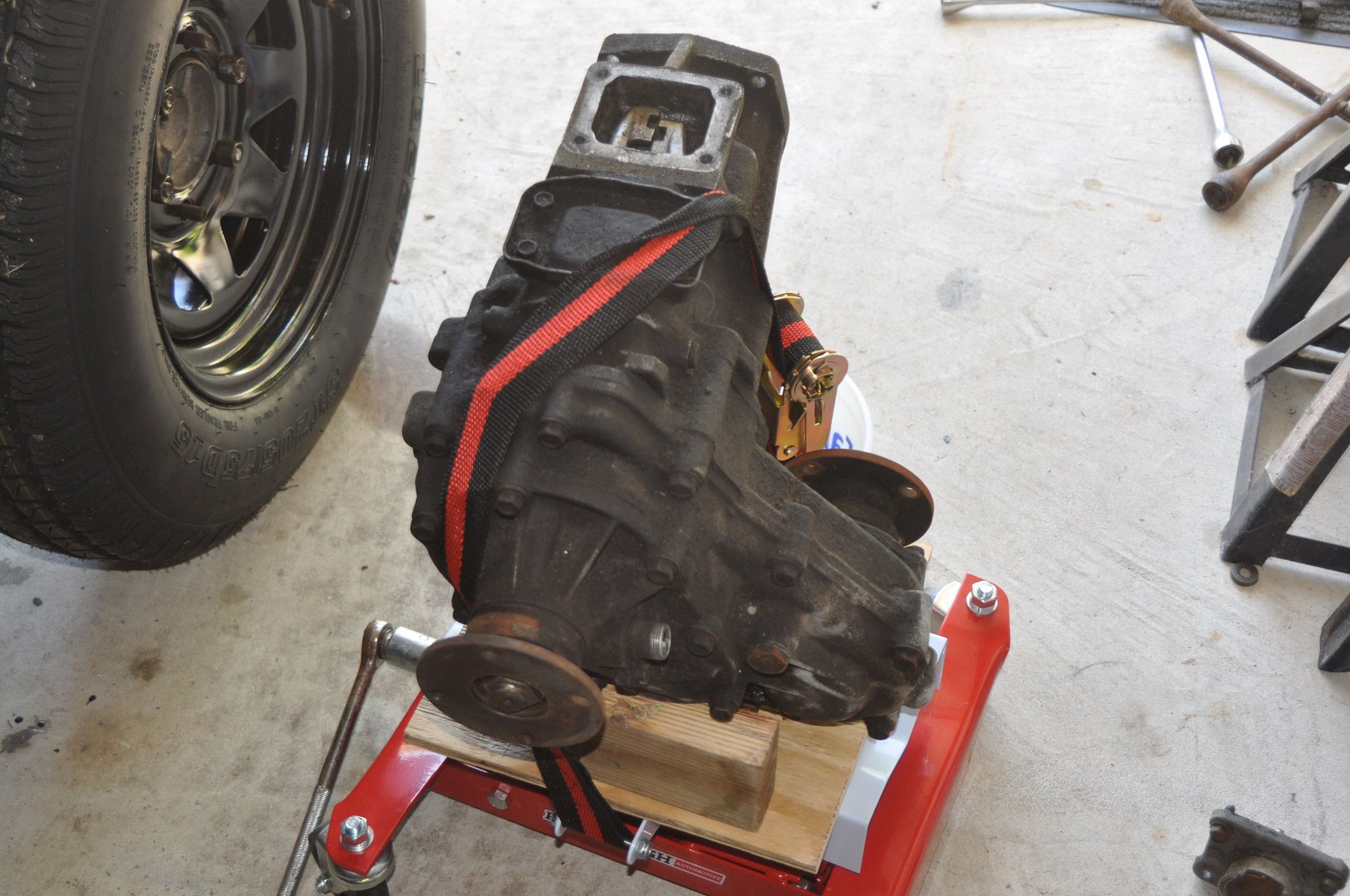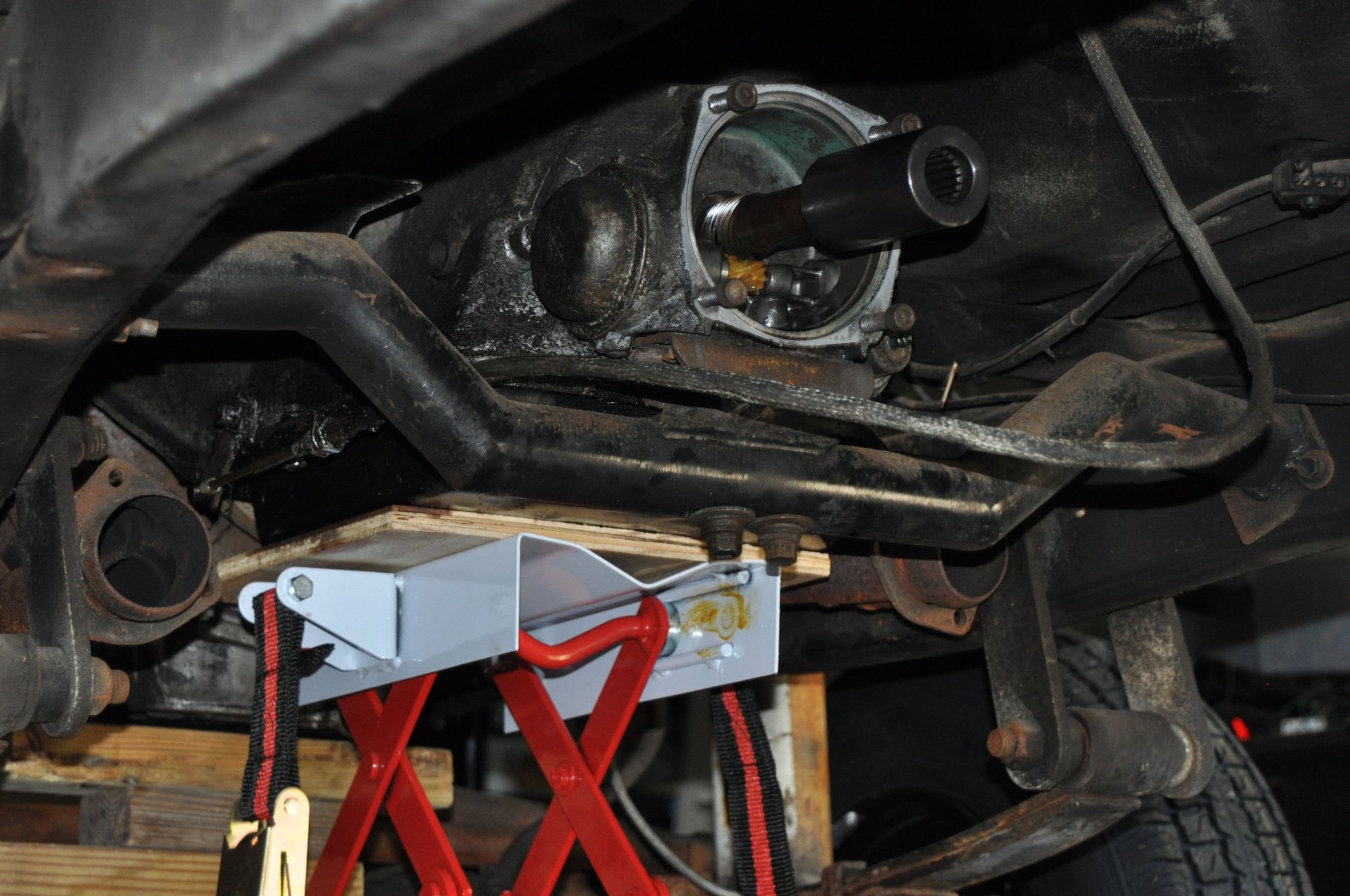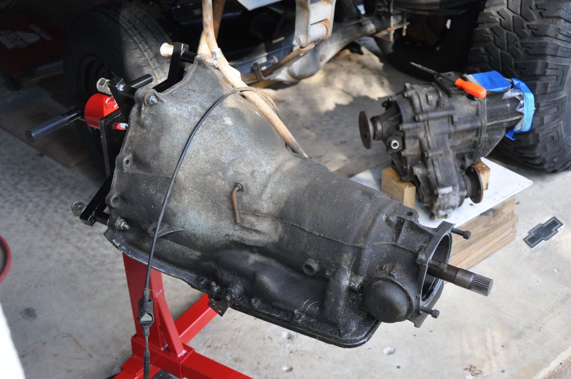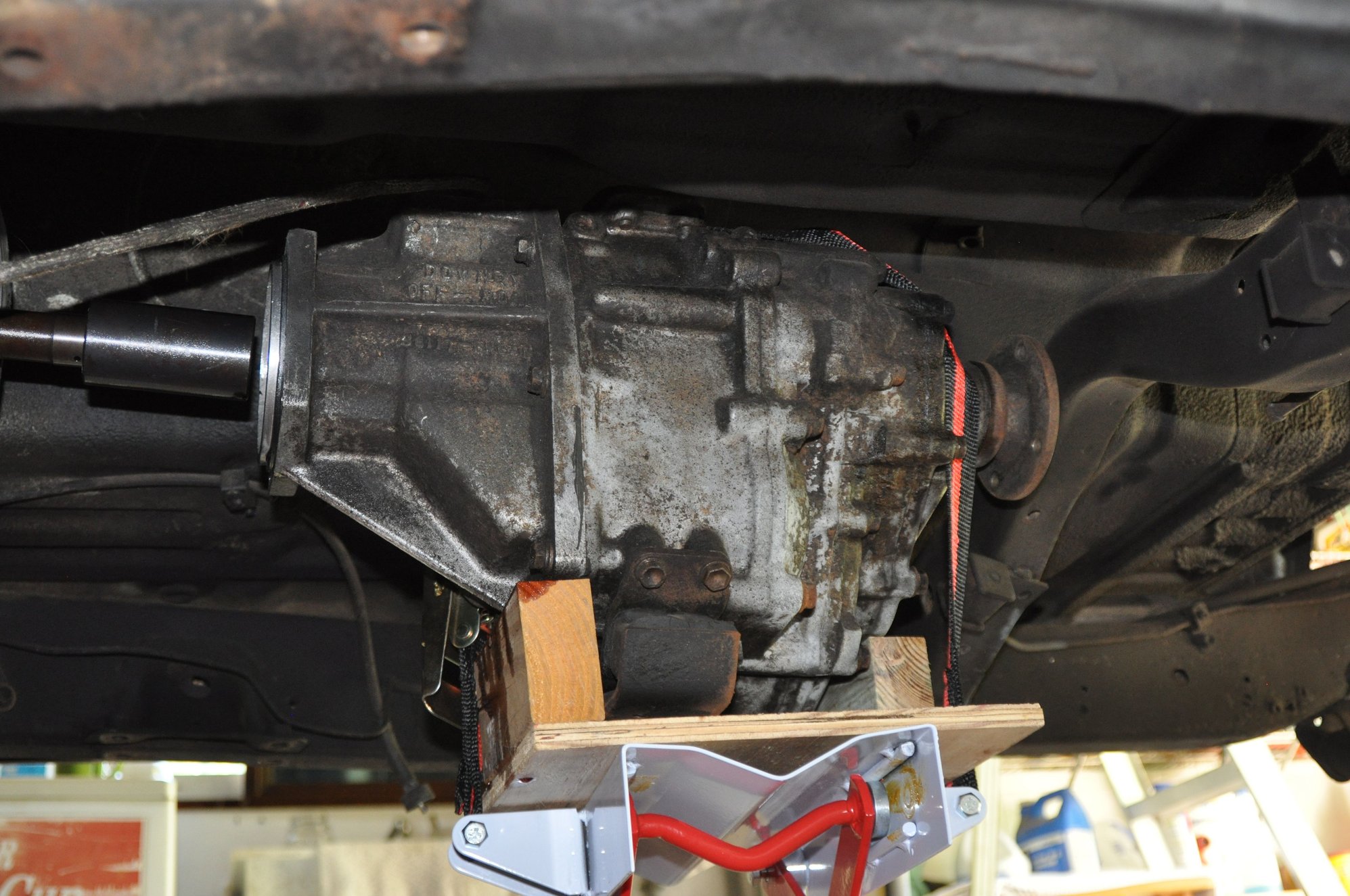 Well, she's been since moved out to the shop in my back yard. I ordered and received a HF transmission jack from ebay. The jack works great and I would buy another one if need be. I read all the reviews and they are correct if you are not careful! Coming down is just fine but when going back up with a heavy trans, you must be centered or it will tilt to one side when raising. Also that strap is kind of a pain and I did use it when I brought my transfer case down but I didn't over tighten it and it was fine. And yes, it can get in the way when not using it, but I worked around it.I didn't use it when bringing down the transmission and I had a piece of 1/2" plywood on the trans platform to avoid slippage with metal on metal and it worked great! It felt good that if I had any problems like I encountered, I could walk away and leave it there knowing it wouldn't come down on it's own over-night like most hydraulic jacks do when they leak. BTW, I had to come back the next day and remove the driver's side header before lowering the trans. That jack rolls very nice! I then rolled it out, mounted the ENGINE STAND mount to the trans, then rolled the set-up into place on the stand and lowered the jack. The engine stand worked great for holding the trans level. Also I cut a couple pieces of 2" X 4"'s because transfer cases seem to be strange odd shapes and are rarely flat underneath. This balanced it perfectly!!! Here's a few shots. OH, and my baby girl was keeping watch for me.........