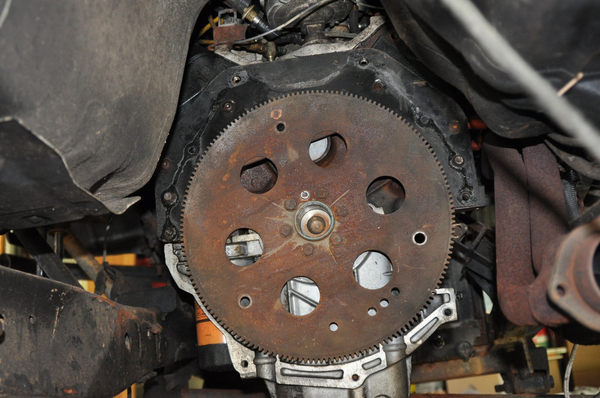 The rear of the engine! I removed the adapter plate from having that BOP installed on the back of this 4.3 and I found i had to remove the fly wheel.I couldn't find any ID number in the top behind the intake manifold so, I'm hoping what I did find on the rear of the block helps to identify the year. I'm thinking it's a 1990. Also, i did ID the Hedman headers used and they are still available for this morf w/ a Chevy engine installed on a 1992 Toyota truck frame. There's also another good site that sells specialty headers for just these morf projects. I put the boards under the oil pan but the engine seems very well balanced and not much pressure on the boards. Anyway, the ID numbers I found are near the upper right area.