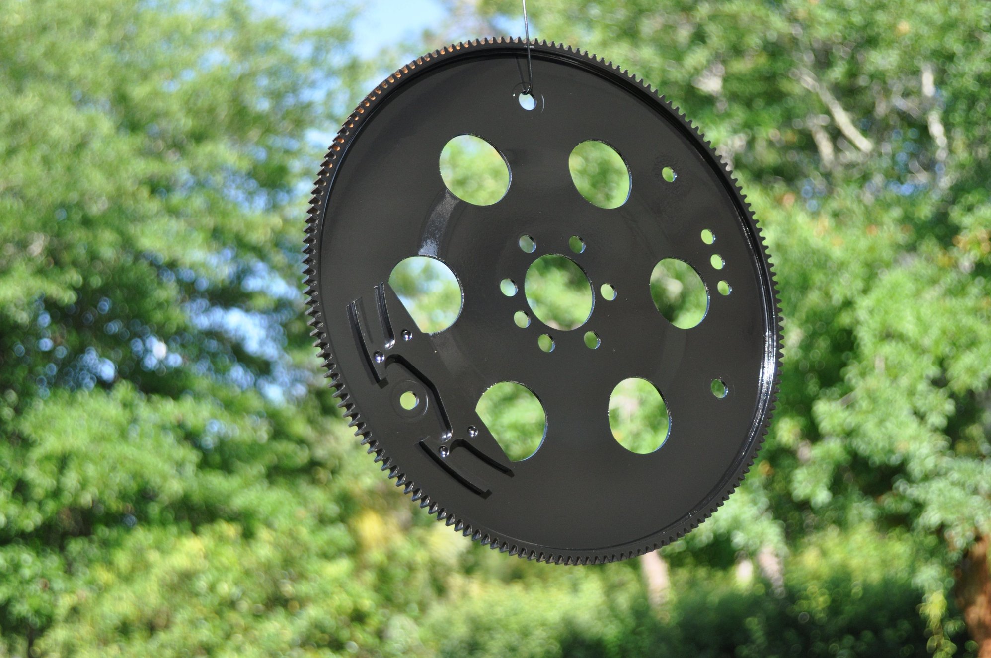 As I wait for someone to answer my PARTS WANTED ads for a TH350 trans, I am de-greasing parts and spray painting them black. I let my flywheel soak over night in White Vinegar ( rust remover) and then the next morning I gave it a quick wire brushing while the rust just fell right off, followed by a soaping and rinse using a plastic hand brush then a couple coats of Home Depot Rust-Oleum Professional spray paint. Now for the cross members. I de-greased the transfer case and will finish it best I can for a shot of paint. I hope the paint insulates against good heat dissipation. In that case I might shoot it white since it's a cooler color. In case some didn't know, black cars seem to absorb heat more than white cars do. I prefer to paint my gas tanks white for that reason. And yes, in Florida it matters and the pavement reflects a lot of heat.......