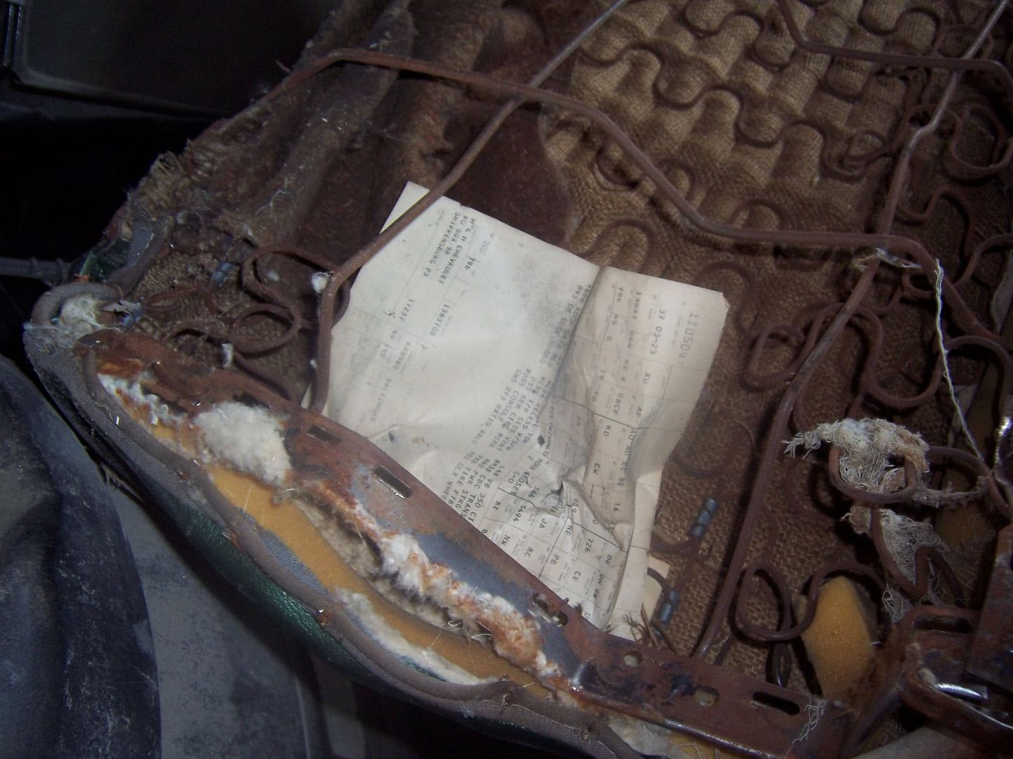 Some more great news! I don't know how I missed it, but today I was poking around in the pile of parts under the barn when a piece of paper caught my eye. I found the build sheet for the car!! It was in the bottom seat cushion actually crimped into the springs on what is the driver side of the lower cushion!! I couldn't believe I had over looked it when I took the car apart initially.