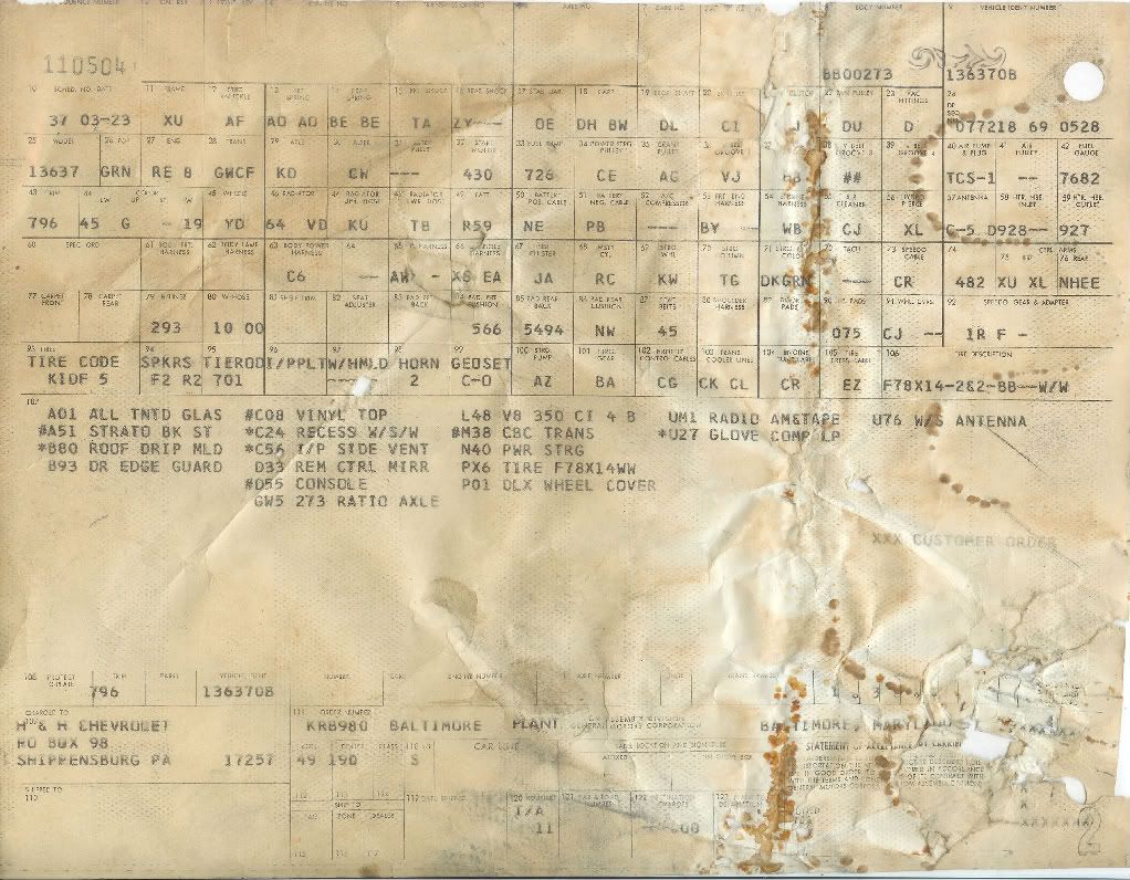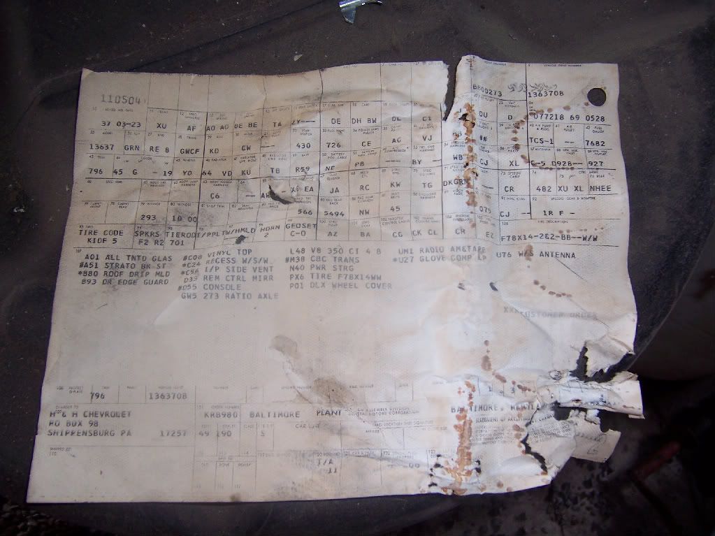 Oh Man! That's awesome that you found the original build sheet for the car. Everything looks good and before you know it, it will be put together and driving her around!