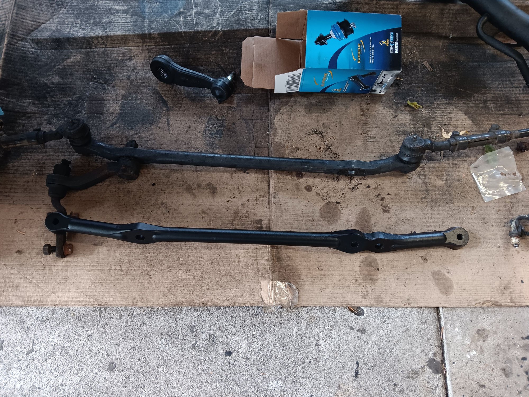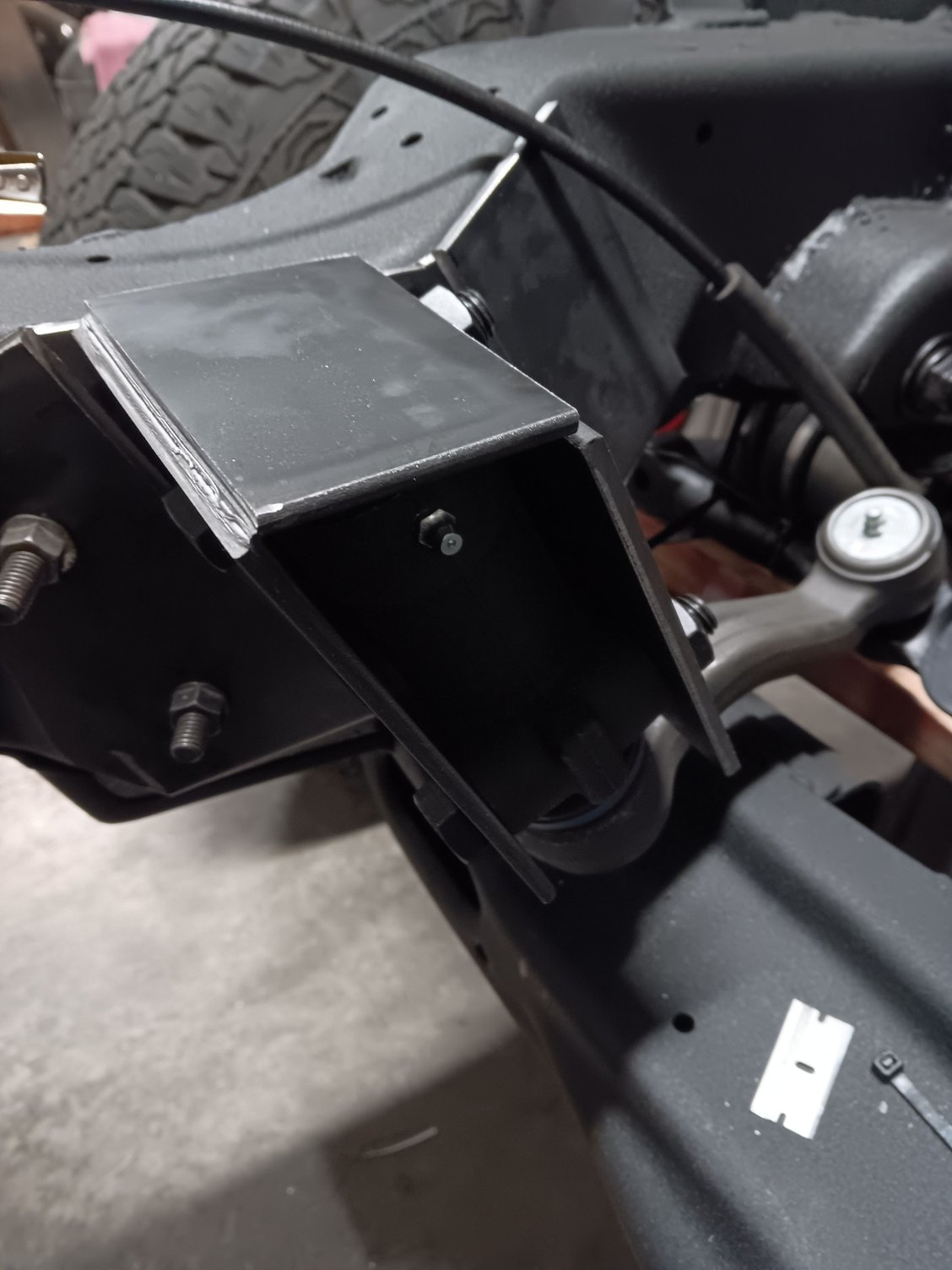 New idler and bracket. Decided to do the 1 ton idler upgrade. These are Mevotech and are much beefier than the stock system. Made the bracket as the Outfitters bracket doesn't seem to be available anymore. Took me way to much time to build but didn't really have a choice I guess. Just started learning to weld recently so while they aren't pretty, they seem pretty strong. The new idler is about 1/2 to 3/4 inch longer than the stock arm so I hope it doesn't mess with the steering and alignment. Tried to keep everything parallel and even as much as possible.