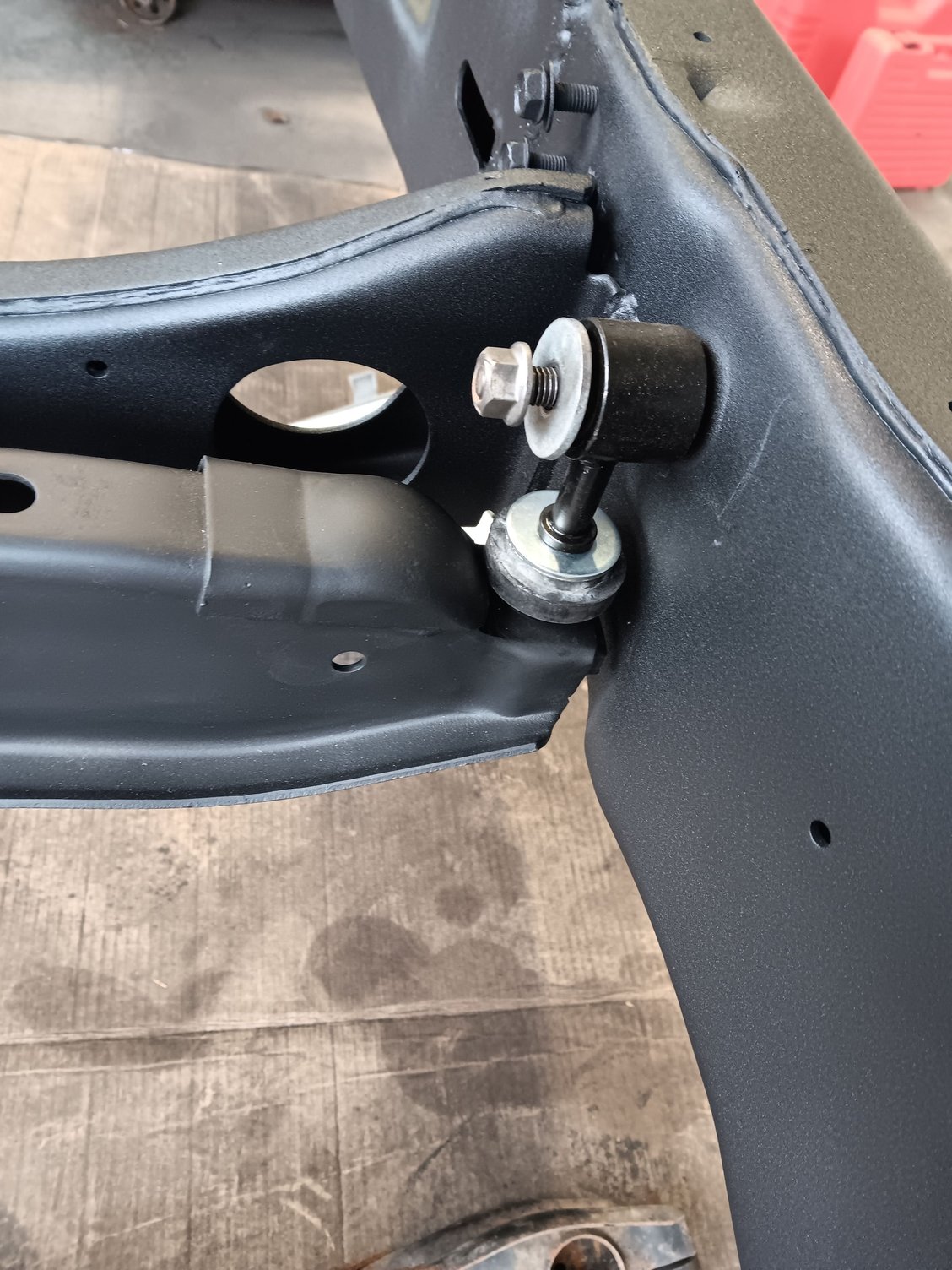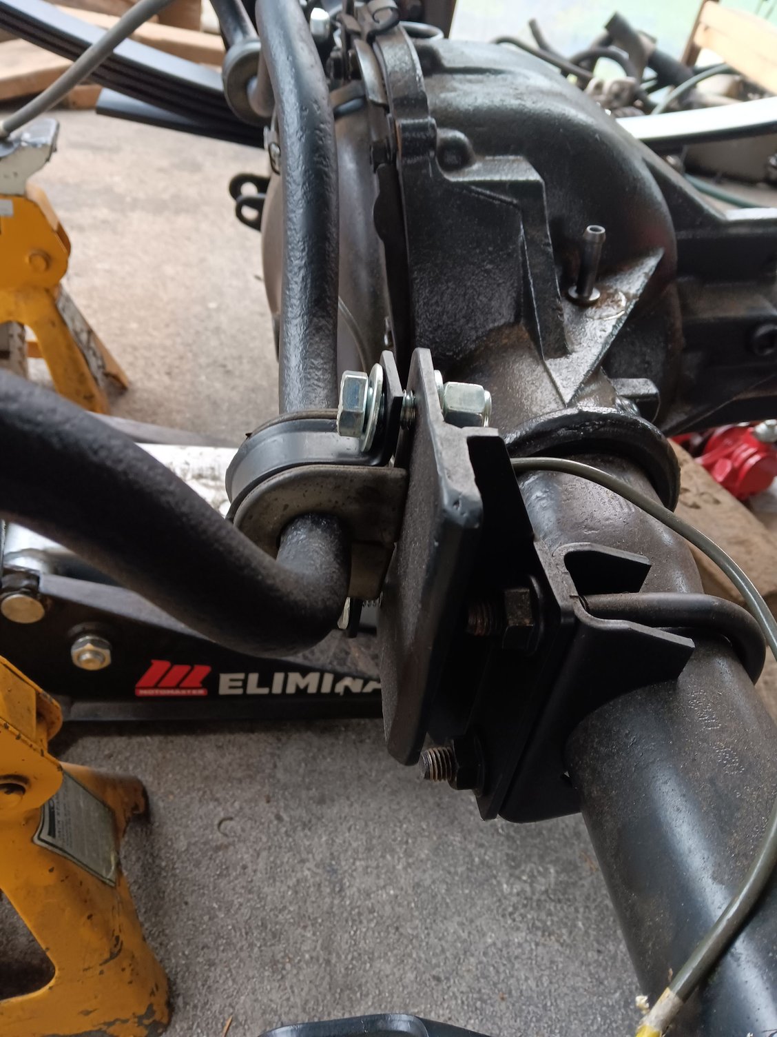 The rear sway bar didn't line up properly with the wider axle so rigged up the Rough Country extensions to fit.