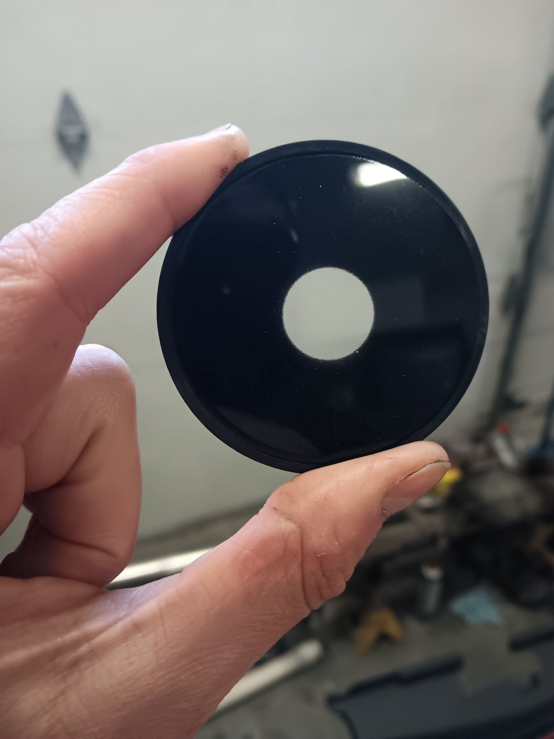 To protect the camera and keep it hidden, the original center cap logo was removed and found some polycarbonate discs the exact size of the center cap. Used a dime to mask the center and painted the rest black. Cut a hole in the center cap backing and used double sided tape to mount the disc to the center cap.