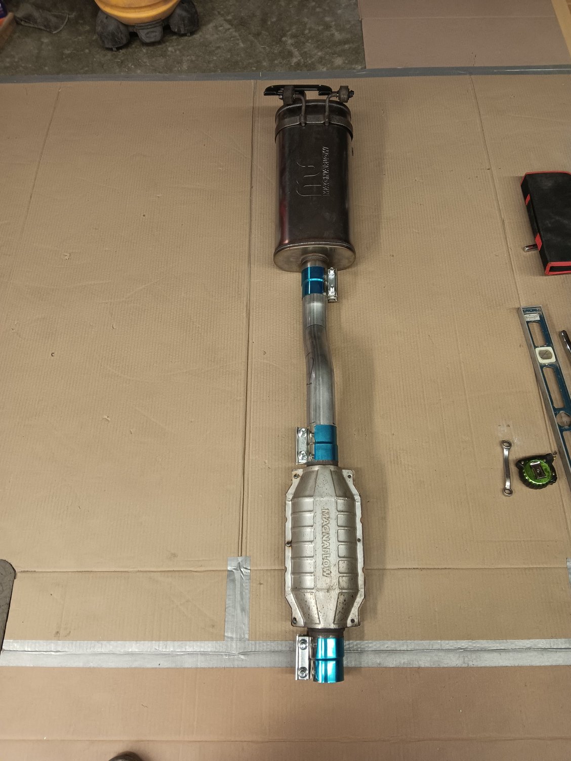 Getting the exhaust mocked up. Used the old cat, had a shop bend a new pipe to the muffler, bought a 2.5 in/out Magnaflow. Once everything is done, I'll bring it to the exhaust shop to get a new tailpipe made to adjust for the body lift. Just have to weld in a new 02 bung and attach a hanger.