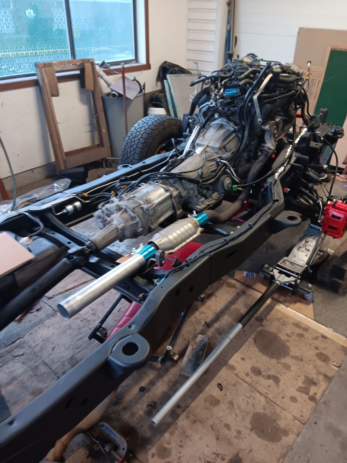 Finally time to move the frame back under the body. Luckily no safety issues and everything went smooth. Used two floor jacks under the rear diff and front crossmember and had to remove the wheels to clear the underside of the body,