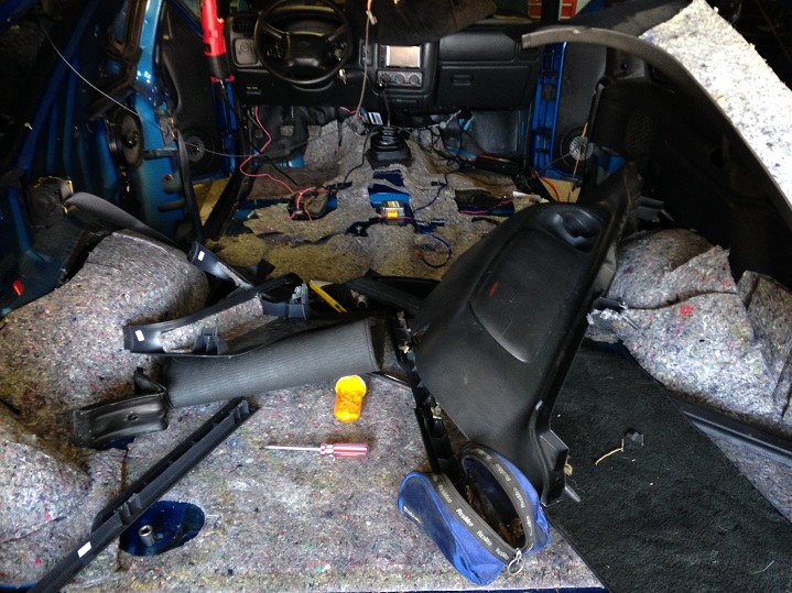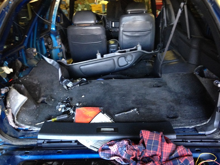The interior is all base so no power. It was really getting annoying to open the rear hatch. I'd have to put everything I had on the ground, put the key in, turn and hold it, lift the glass, and finally I could put everything in the back. So out comes the interior and I wired up power locks, power rear hatch release, and a rear view camera.
