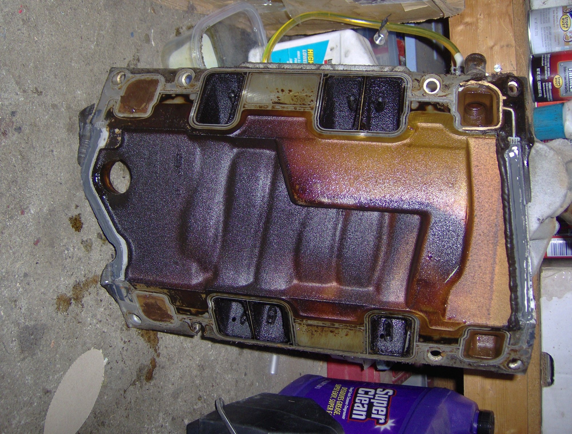 Have you taken your LIM off yet? The gaskets can fail catastrophically and dump coolant directly into the lifter valley if you are unlucky.