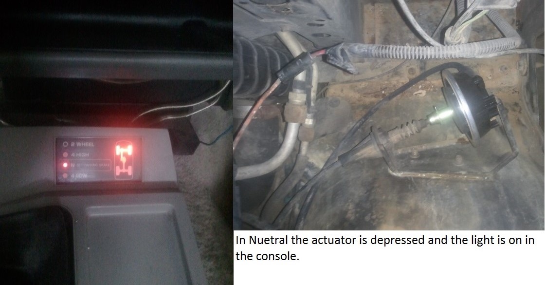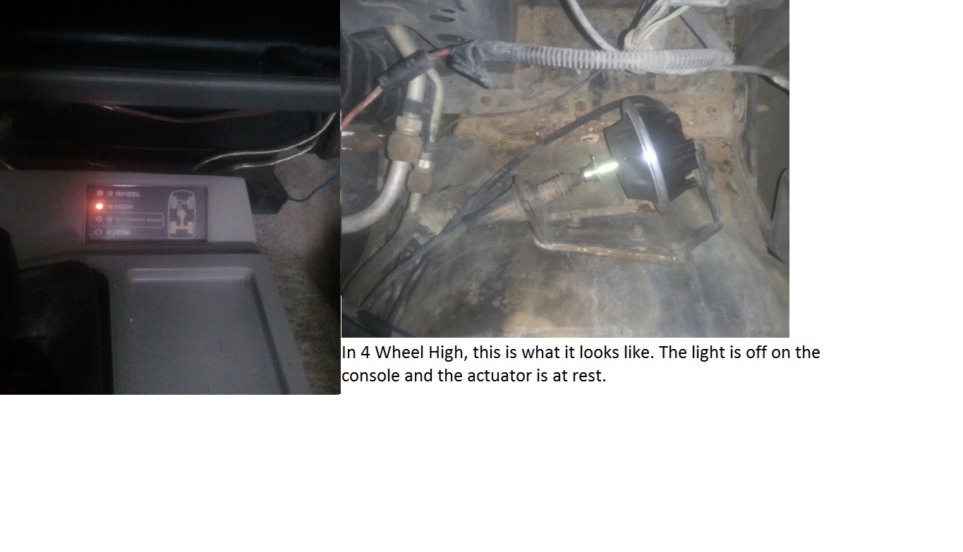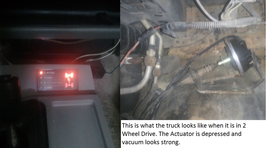 I am having an issue with my 91 s10 blazer's 4x4 capability. I recently took it to a shop that said that they fixed it but it seems backwards to me. Anytime the truck is in 2 wheel drive or 4x4 N , the light on the console shows the front wheels active, the actuator is depressed and shows good vacuum. Whenever the truck is in 4 high or 4 low the lights for the front wheels go off and the actuator is at rest. I have included some pics so that you can see what I am talking about. I am thinking that there is a problem on the shifter in the cab but before I started trying to get that worked out, I wanted to make sure with you good people because you have helped me so much in the past. It is also completely possible that I am stupid and this is the way that it is supposed to work. But everything I have seen online and common sense says that the cable should only be pulled when 4 wheel drive is engaged. Any help you guys can offer would be greatly appreciated. Thank you all and have a great Easter.