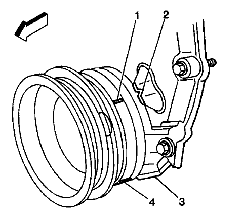 IMPORTANT: Rotate the number (1) cylinder to Top Dead Center (TDC) of the compression stroke. The engine front cover has 2 alignment tabs and the crankshaft balancer has 2 alignment marks (spaced 90 degrees apart) which are used for positioning number 1 piston at top dead center (TDC). With the piston on the compression stroke and at top dead center, the crankshaft balancer alignment mark (1) must align with the engine front cover tab (2) and the crankshaft balancer alignment mark (4) must align with the engine front cover tab (3).