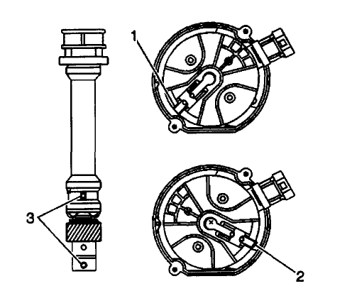 3. With the gear in this position, the rotor segment should be positioned as shown for a V6 engine (1) or V8 engine (2).