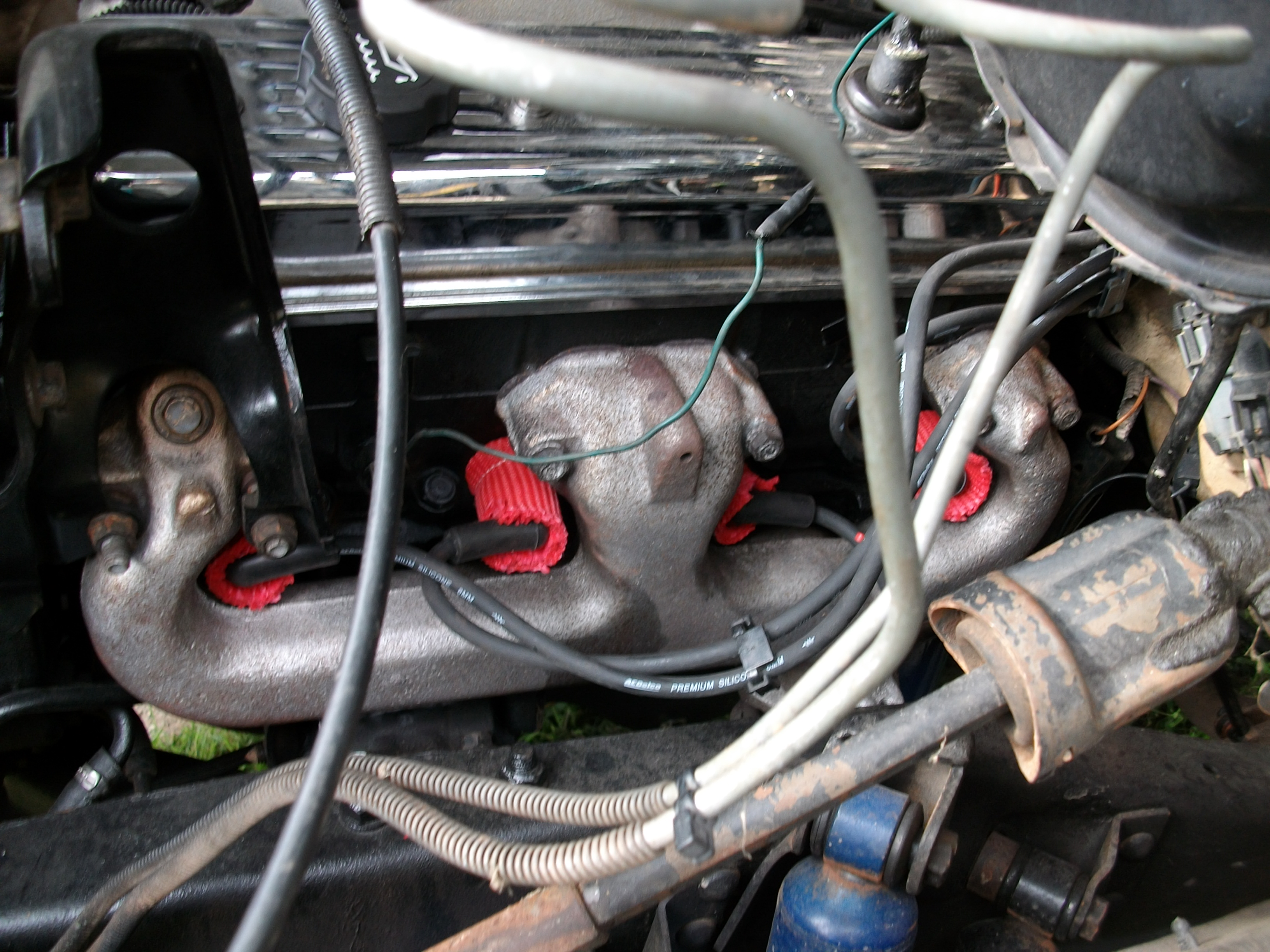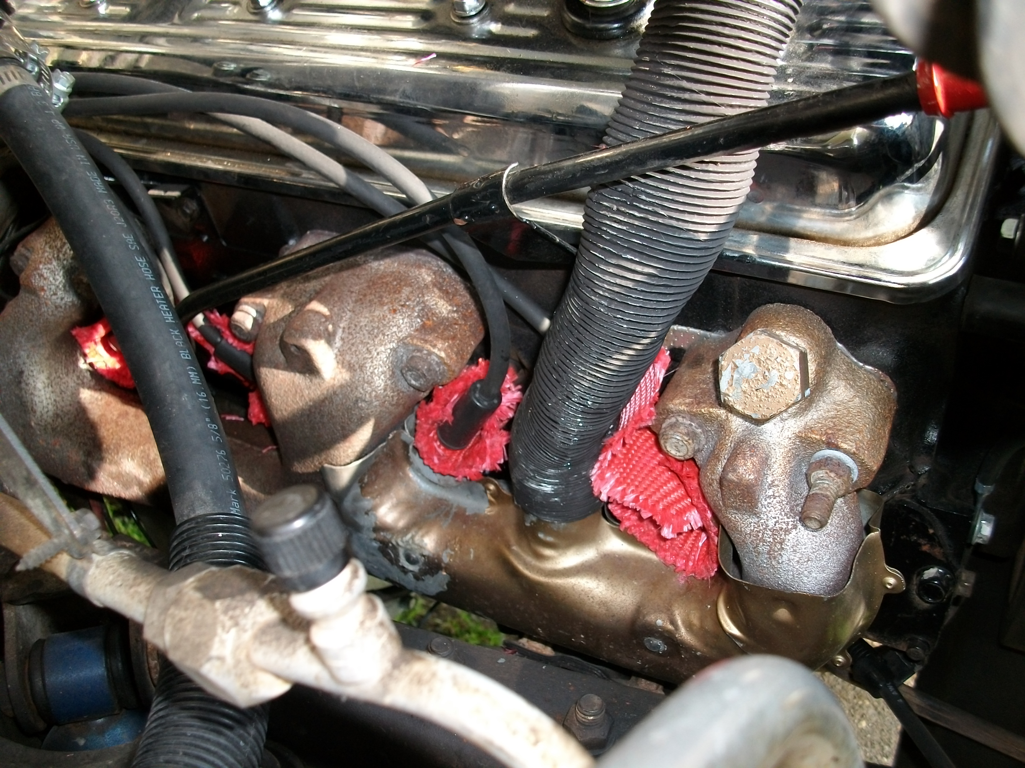 I have a brand new AC Delco wires, ( lifetime warranty) and it has a MSD 40K volt coil and cap and rotor. The only place where the exhaust close to the wires in at the 90 degree boot at the plug connection. So I made some asbestos "booties" and have them fit over each wire connection. The #2 is the worst as the plug wire boot is like 3/8 of an inch from the super hot cast iron manifold. Tried 2 different sets of "Shorty Headers" but none will fit this engine bay. In the first picture, you can see the black frame sitting 4 inches from the heads ?
