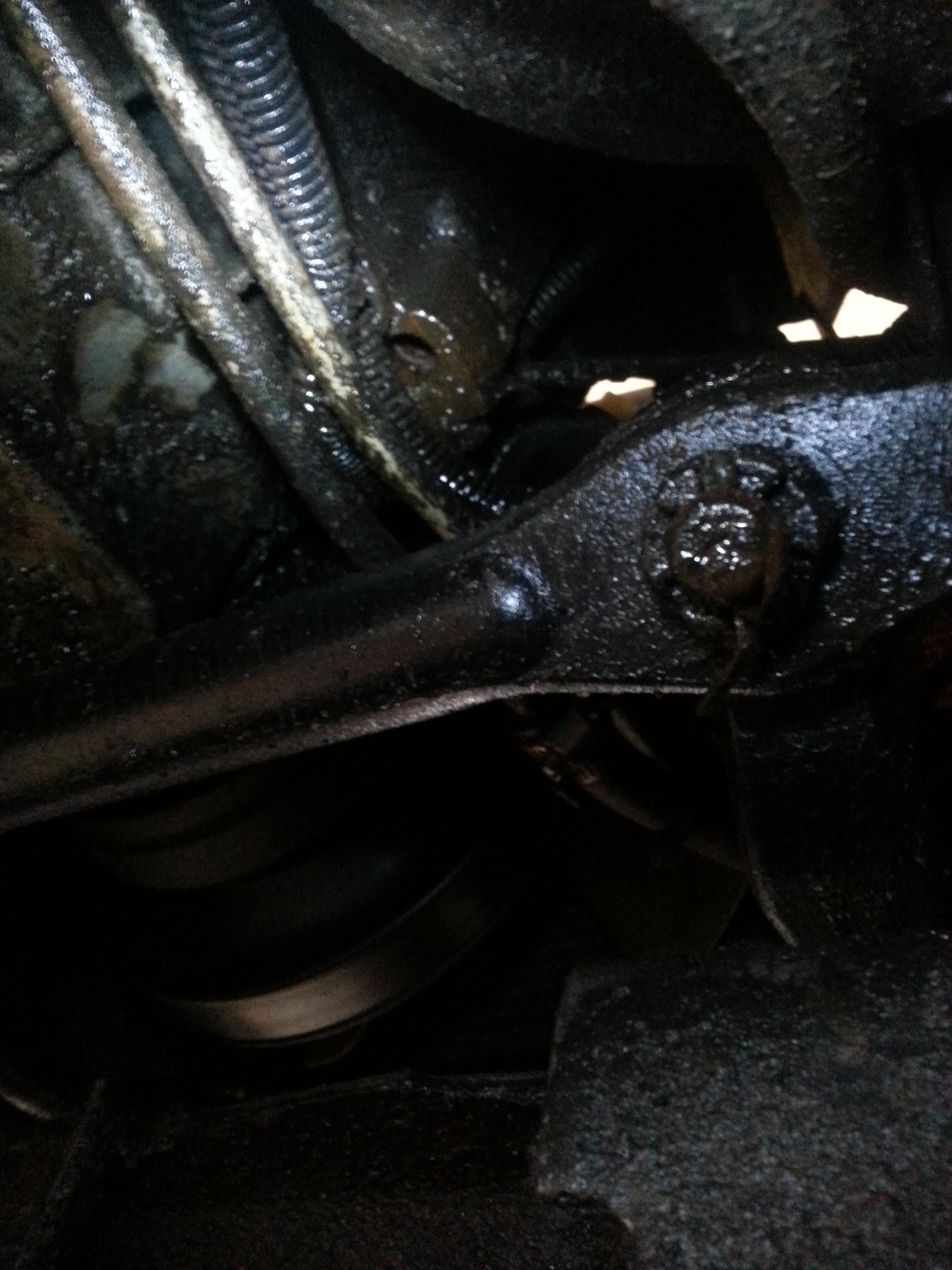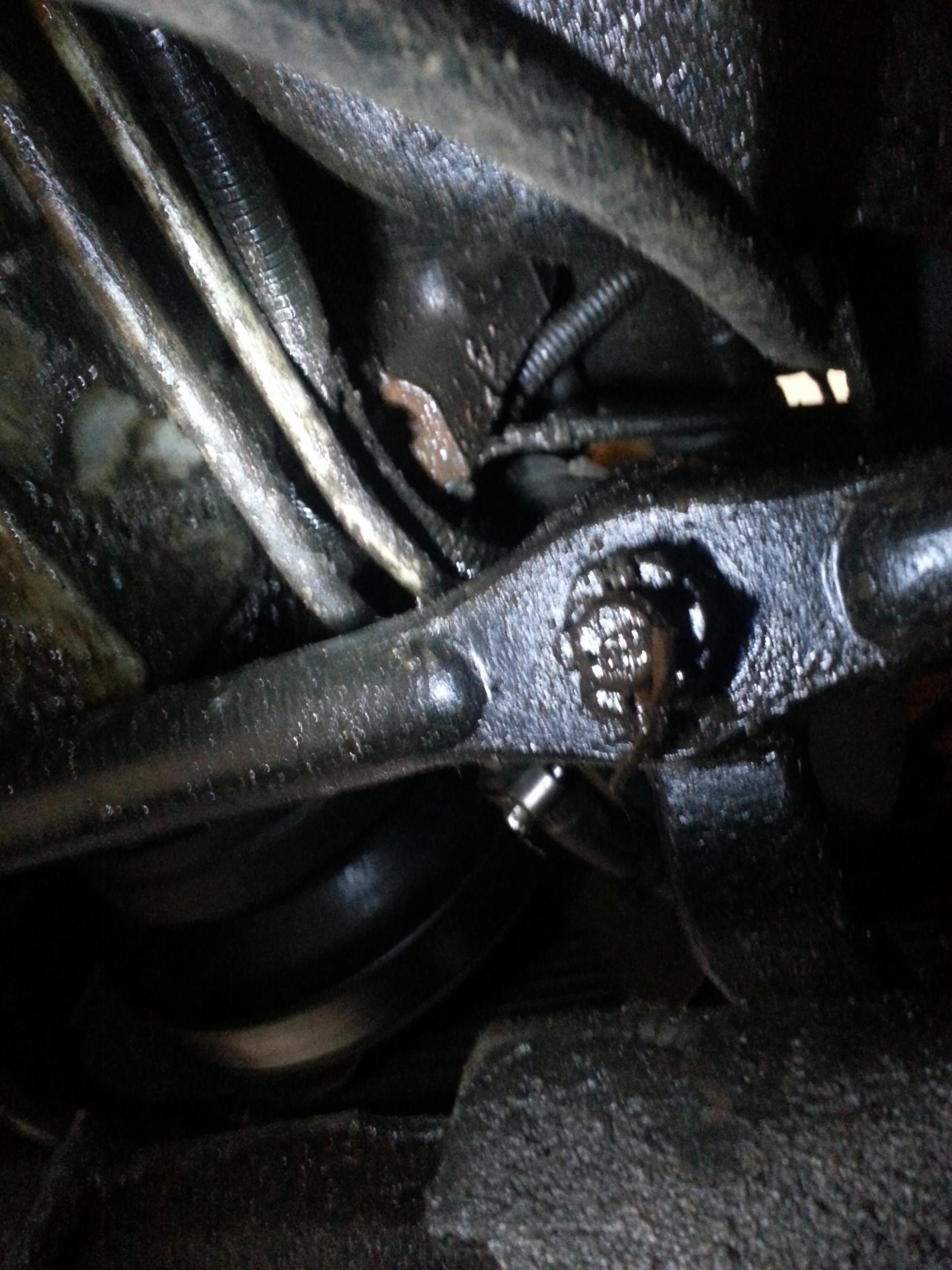 I'm pretty sure my water pump needs replacement (pretty much dumping all my coolant on the ground after I park). That said, I just got under it to take a look and I noticed that there is a hole and I don't know what it's for or if it is supposed to be there. I took some pictures. It's right above the tranny cooler lines. I just need someone to go outside and look if their truck has the same deal, or if something is supposed to be there and isn't.