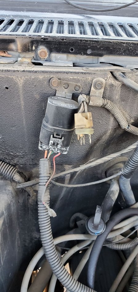 I'm not sure what that square 4-wire plug is up on the firewall in your truck. My '90 'burb doesn't have it. I also do not know what the connector is that you have over on the driver side inner fender area.