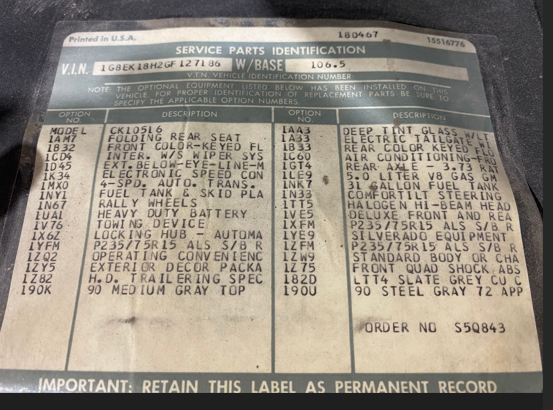 I have an 1986 K5 that came with a 305. There is no diagram sticker on the radiator support. I noticed in the manual that there are a few versions for the year. How do I find out which setup I have? There were options like high altitude, Cali, and alternate.