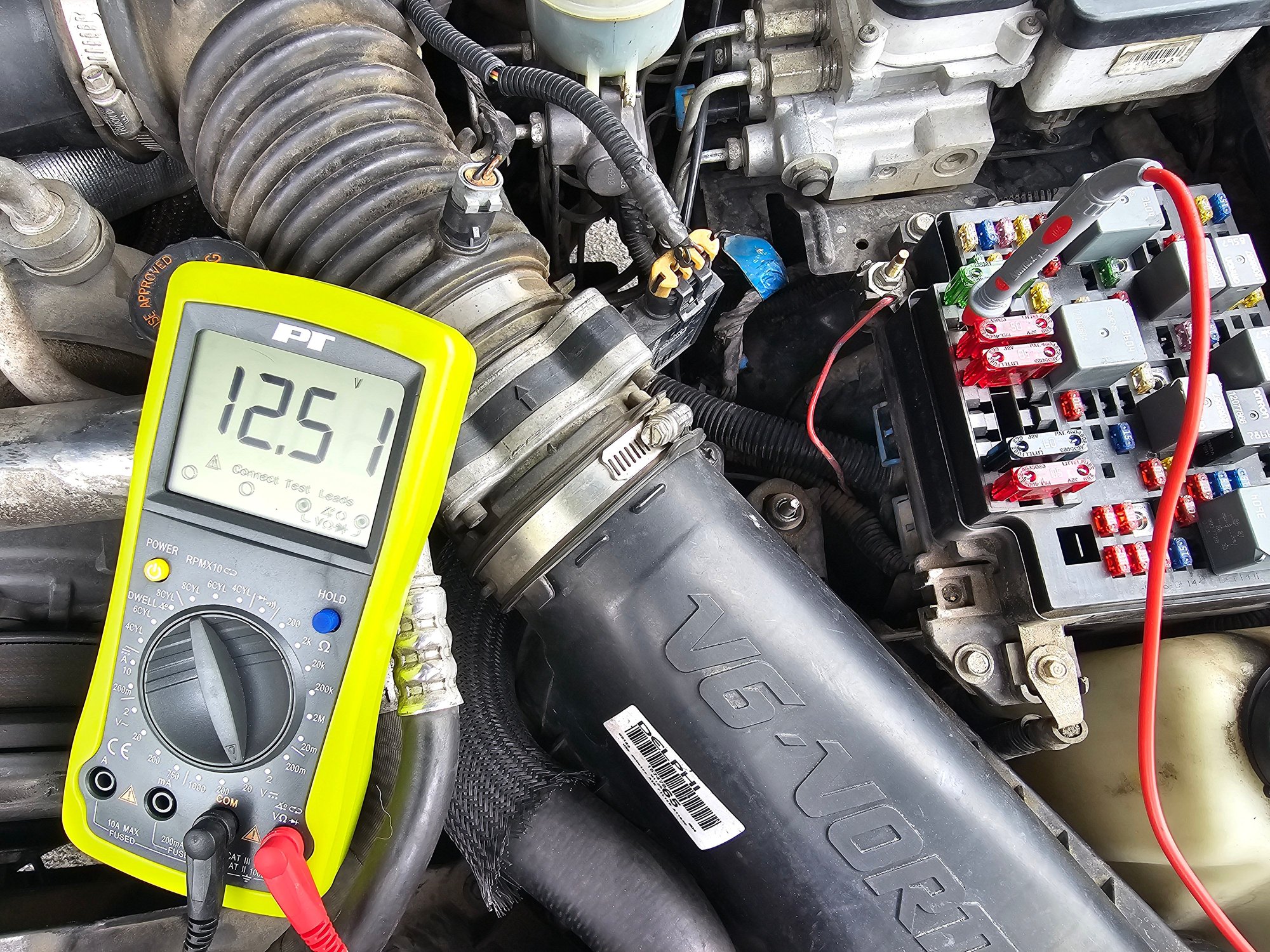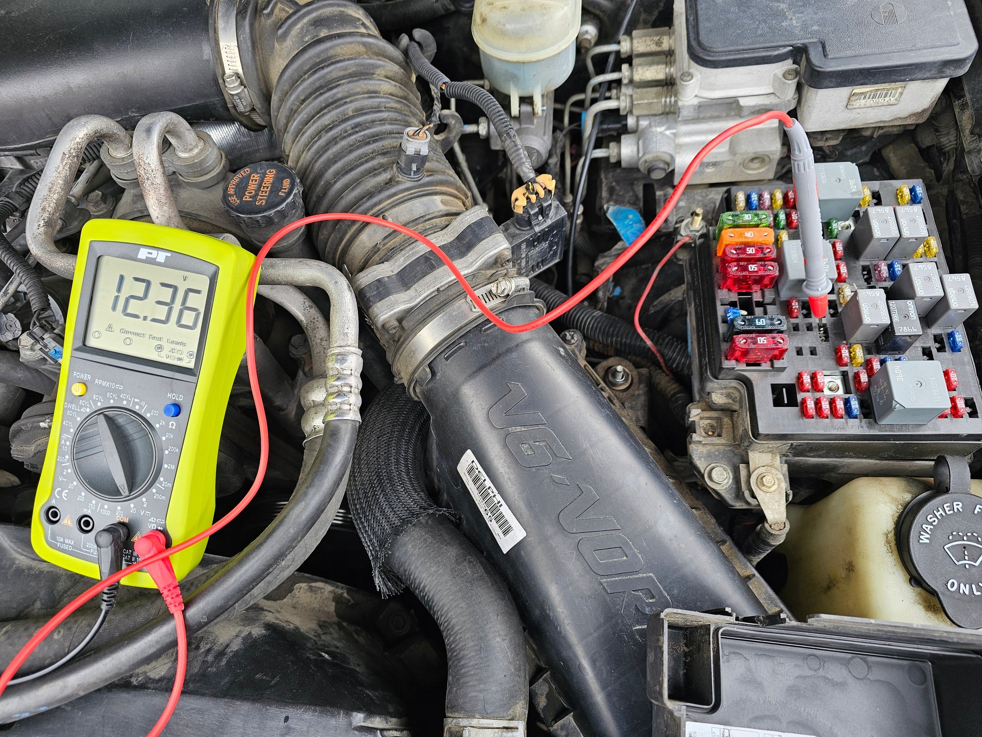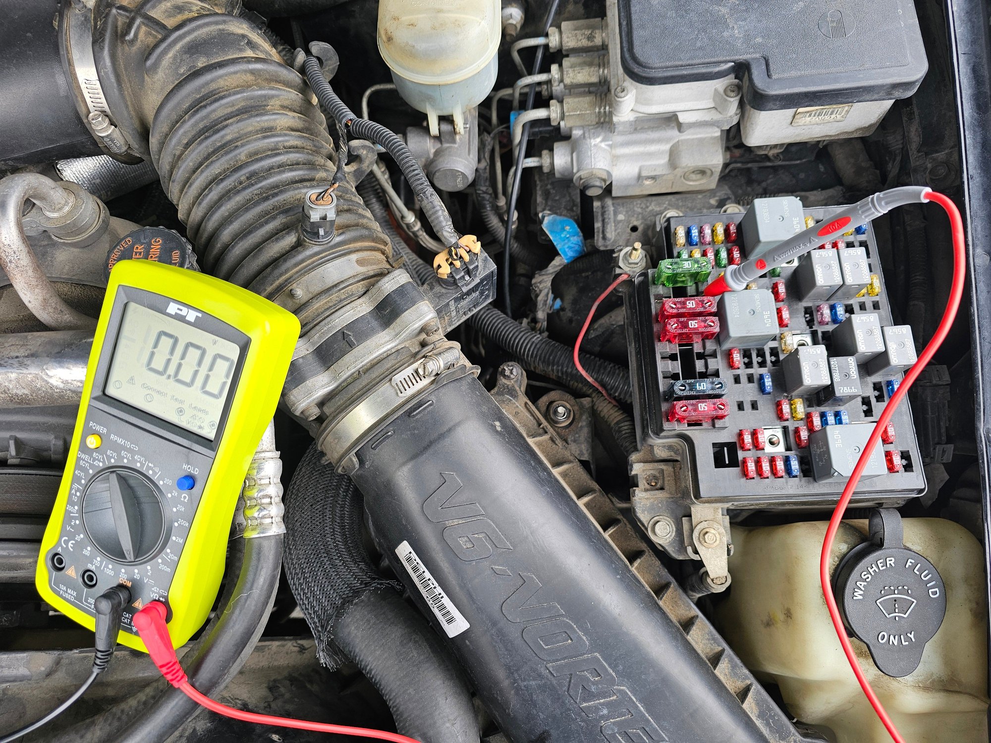 OK so we have a properly charged battery and the 175A maxifuse is OK, at least with no load. Next remove the ECM1 fuse (15A), turn the ley to run (key on) and test the voltage in both fuse pin sockets. Then turn the key to start and do the same for the crank fuse (10A).