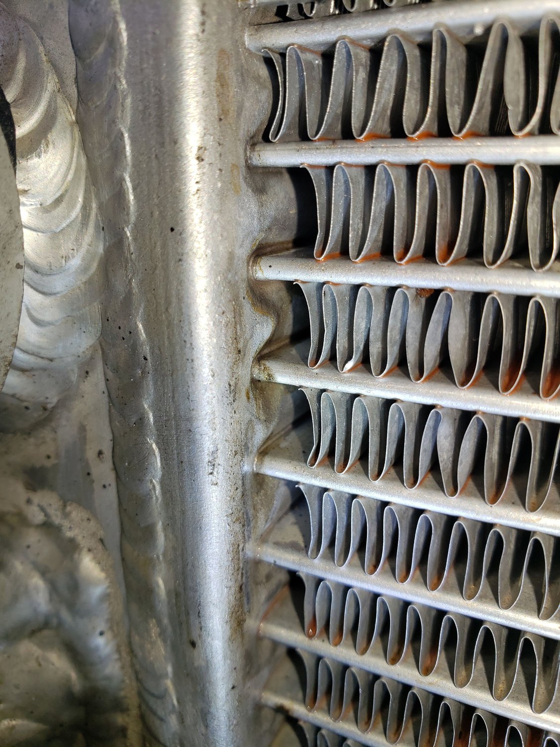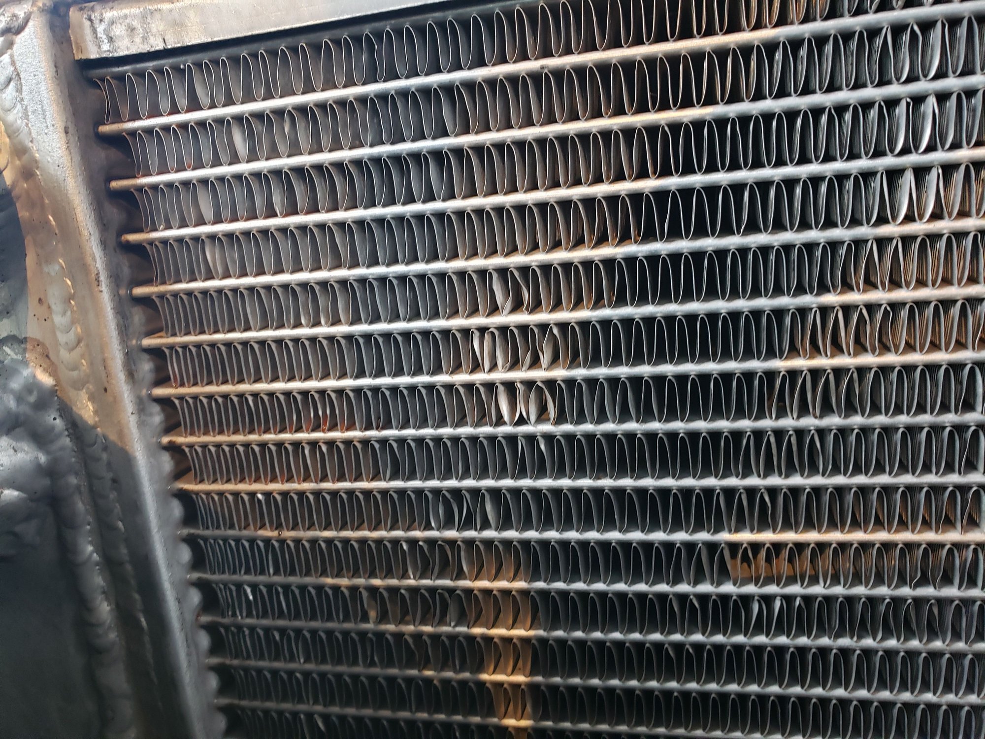 You can see the coolant between some of the cooling fins. There is slight staining of the aluminum where the flat tubes enter the side-tank for the top 6 of them.