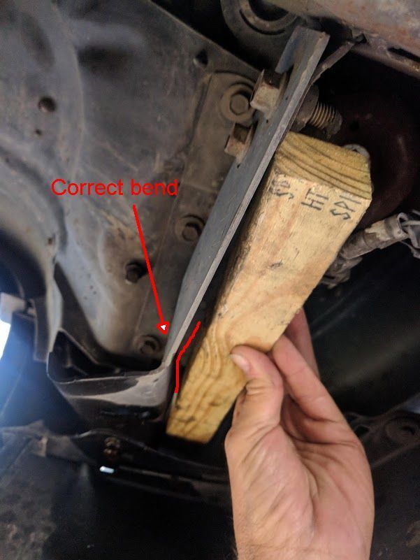 Bumper is back to position. I did order the new brace but it turned out to be unnecessary because the metal is actually only .12" thick and bends too easily. The bumper jusr rebends the brace. So I got a look up at the two right side bumper bolts and saw that they has been pushed all the way back in their adjustment slots, which were about 1" long. I was able to loosen the bottom one and with a pry bar lever the bumper's bolt to the forward end of the slot. Then I did the same thing to the upper bolt. Afterwards I ran an additional bolt up into the free space, just in case the bumper tried to backslide. Fixed!