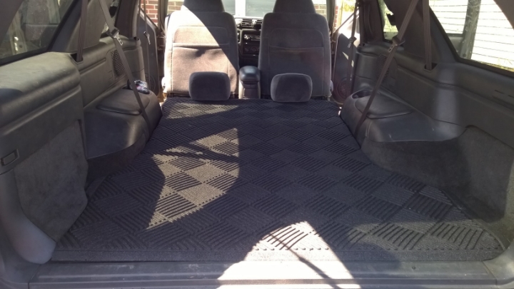 I have a 2 door Blazer and I have my back seats folded down about 97% of the time. I wanted a rubber cargo mat to cover the entire area because I either have dogs back there, my mountain bike, golf clubs, camping gear, etc and it gets pretty nasty after a while. I had a car seat cover that I had down that kind of worked but it ripped and didn't fill the space so I needed to replace it. The problem was I couldn't find a cargo mat that was big enough to fit and it wasn't exactly cost effective to order two different mats.
