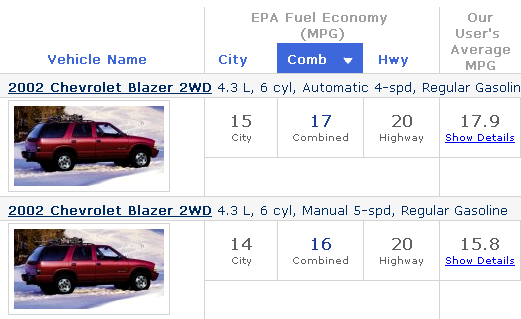 I get significantly better than EPA estimates (below) with consistent 18+mpg city/23+mpg highway. I'm a conservative driver, keeping acceleration moderate, speed low, and tire-pressure high.